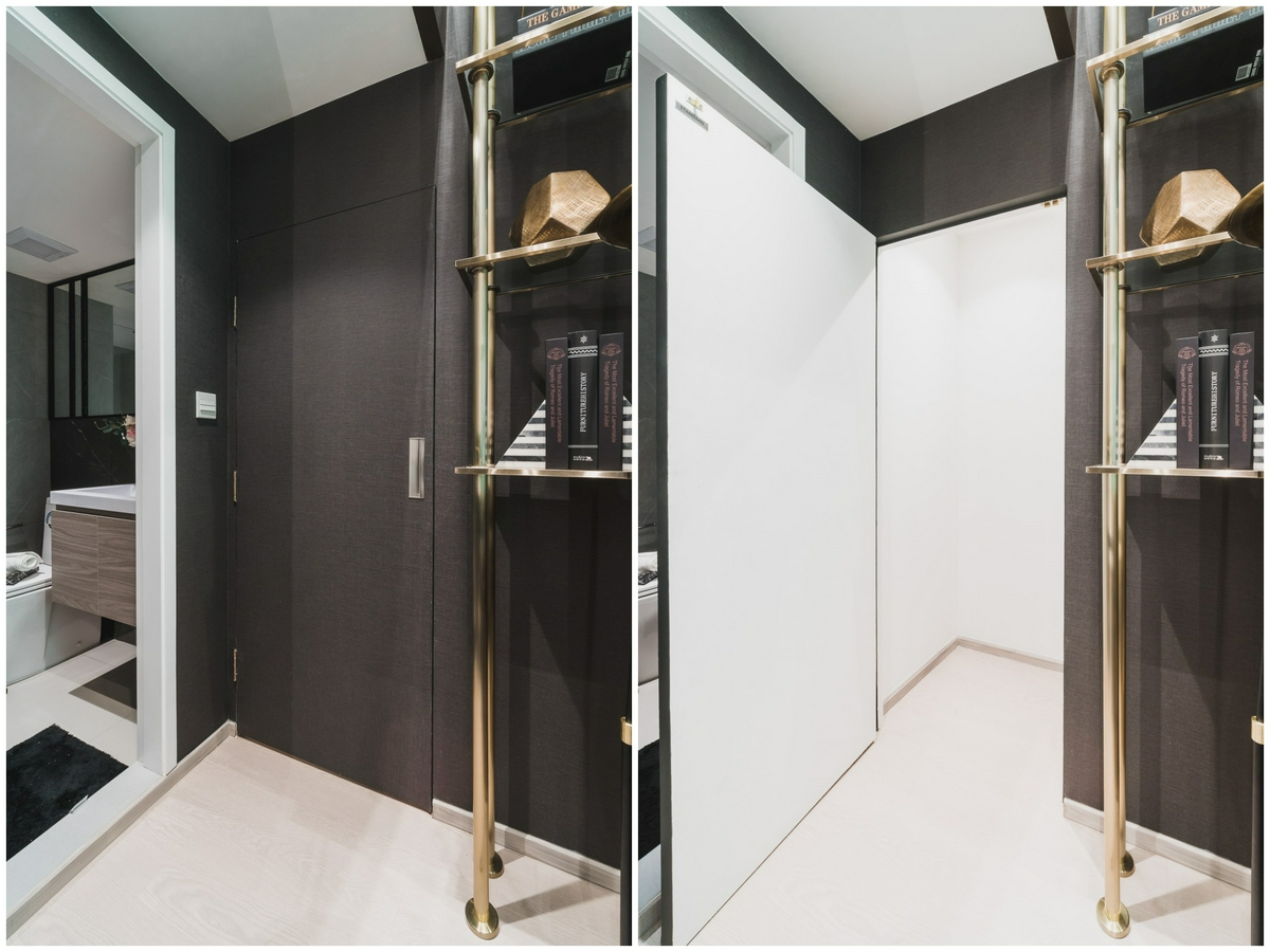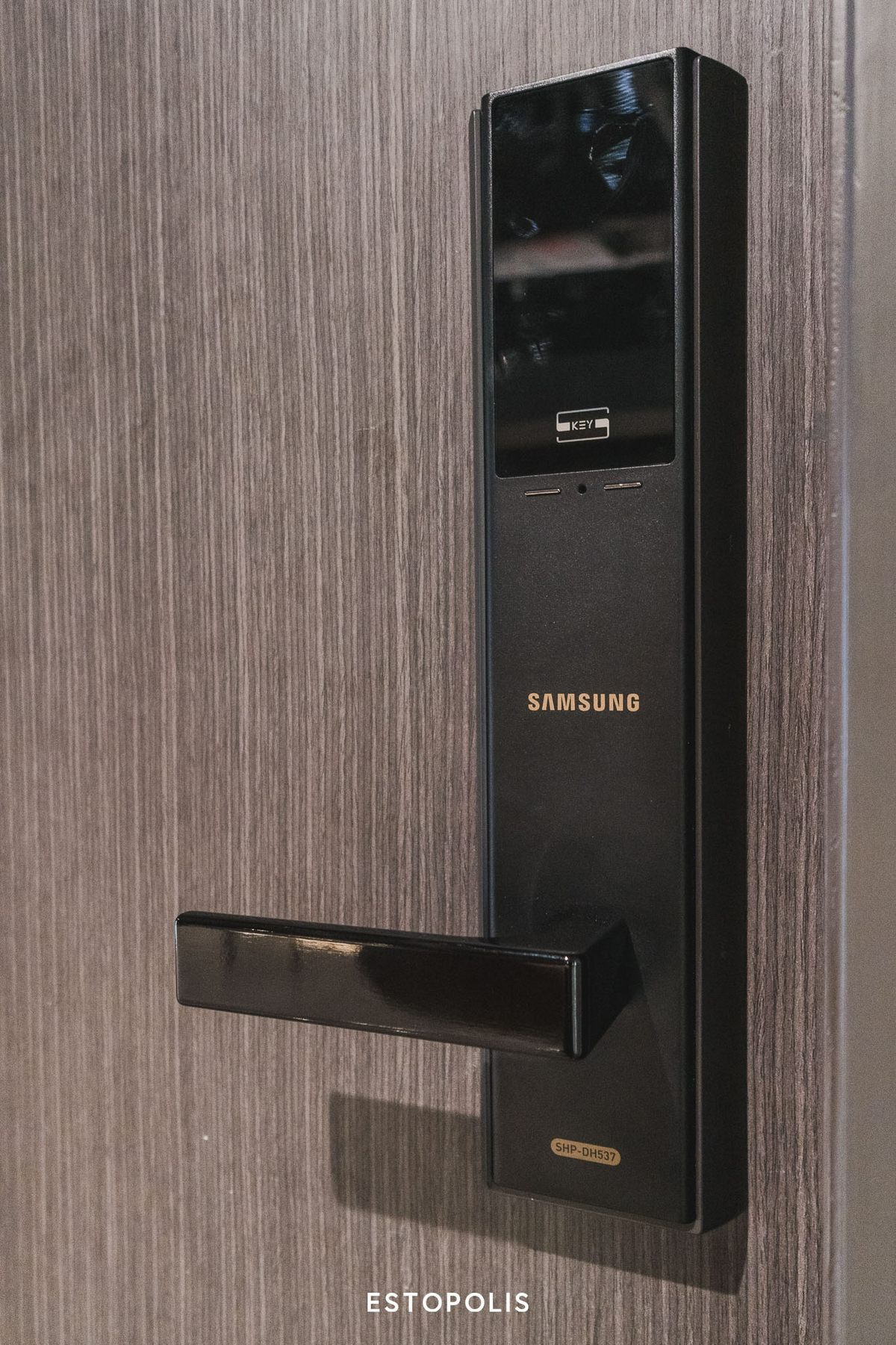 บานประตูทางเข้าห้องจะใช้เป็นไม้ HDF สำเร็จรูปกรุด้วย Laminate ทั้ง 2 ด้าน ส่วนกลอนประตูจะติดตั้งระบบ Digital Door lock จากแบรนด์ Samsung สามารถเลือกเปิดได้ทั้งรหัสพิน และคีย์การ์ด