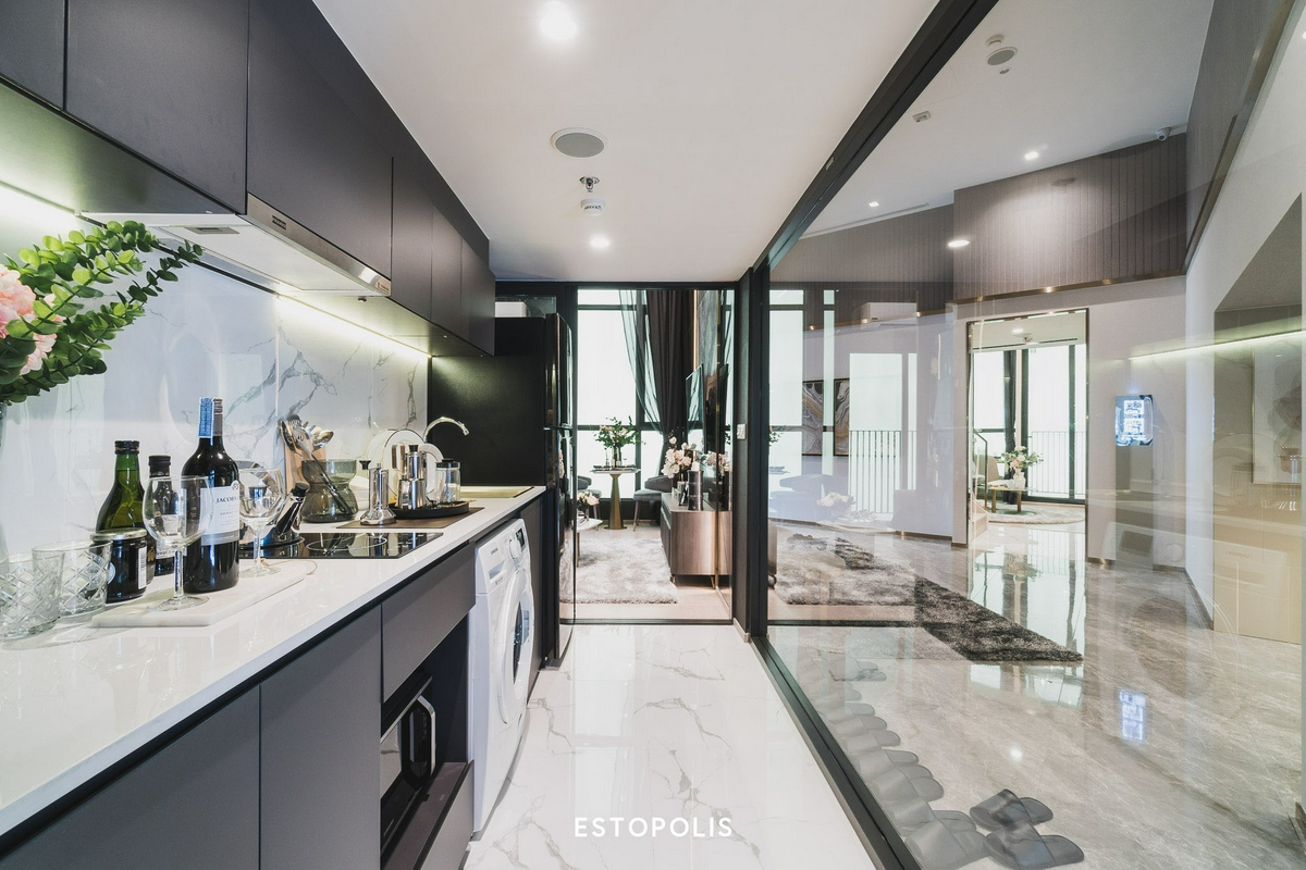 เริ่มจากบริเวณทางเข้า ที่เมื่อเปิดประตูเข้ามา เราจะยืนอยู่ในส่วนของ “ห้องครัวปิด” ก่อนเป็นลำดับแรก โดยห้องครัวจะมีลักษณะเป็นแนวยาว ลึกเข้าไปเชื่อมต่อกับพื้นที่นั่งเล่น ทำให้เรามีพื้นที่ Top ครัวไว้ใช้ประกอบอาหารได้อย่างเต็มที่ เหมาะอย่างยิ่งสำหรับคนที่ทำอาหารทานเองเป็นประจำ ติดกันจะเป็น “ห้องน้ำ” และถัดเข้าไปก็จะเป็นพื้นที่ส่วนกลางของห้องทั้งหมด อย่าง “ห้องนั่งเล่น” ซึ่งจะอยู่ติดกับระเบียงด้านนอกนั่นเอง
