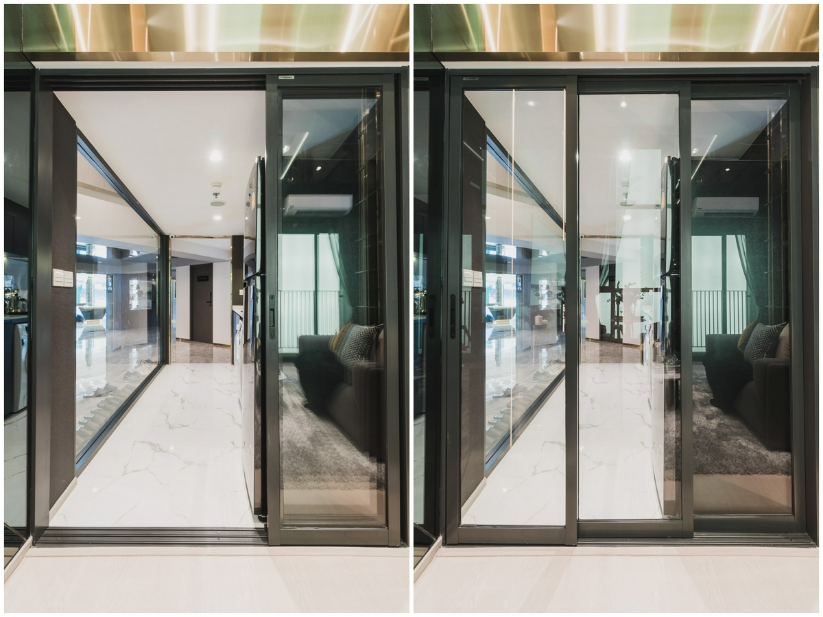 สำหรับประตูห้องอเนกประสงค์จะเป็นบานเลื่อนกระจกใสแบบเข้ามุม ทำให้มองเห็นพื้นที่ด้านนอกได้ชัดเจน ช่วยให้ห้องดูไม่อึดอัด อีกทั้งยังสามารถเปิดออกเพื่อเชื่อมพื้นที่ทั้งสองส่วนเข้าด้วยกัน