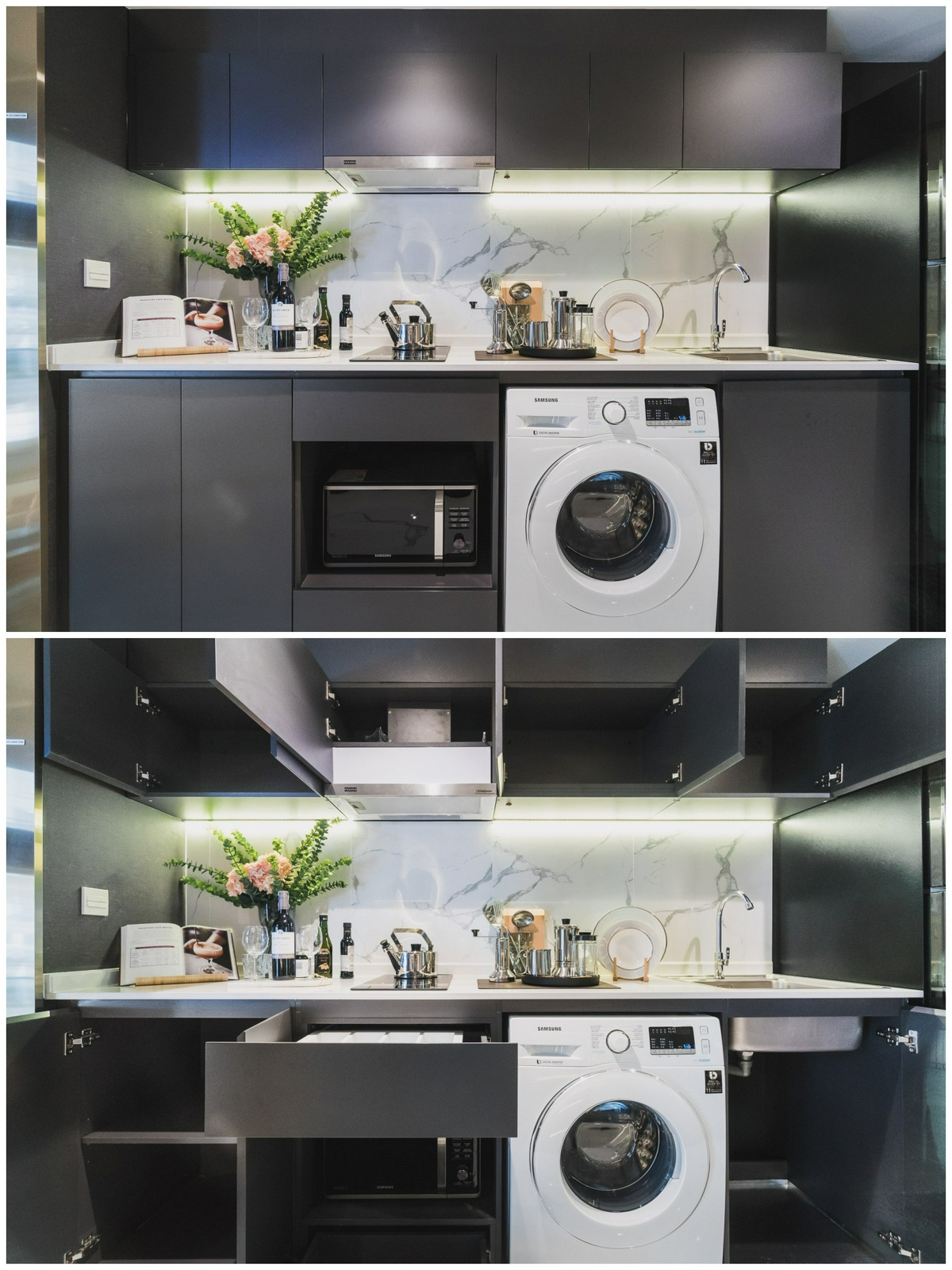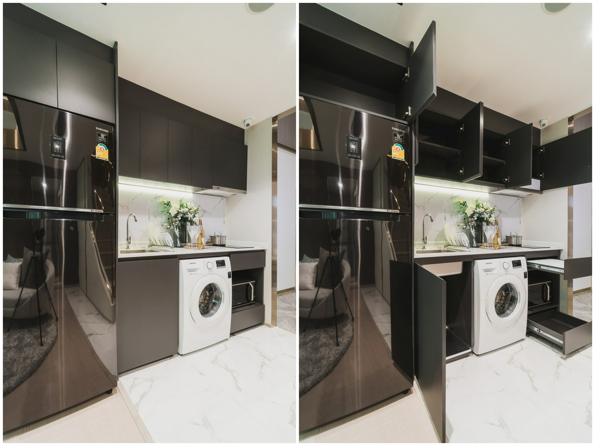 พร้อมตกแต่งชุดครัวด้วยหน้าบาน UV Coated Panel โทนสีเทาเข้ม ที่ให้ความโมเดิร์น เรียบหรู เข้าได้กับการตกแต่งหลากหลายสไตล์ โดยบานเปิด-ปิดทั้งหมดจะเป็นแบบ Soft Close พร้อมเว้นช่องสำหรับใส่เตาอบ และวางระบบสำหรับการติดตั้งเครื่องซักผ้าฝาหน้ามาให้เรียบร้อย