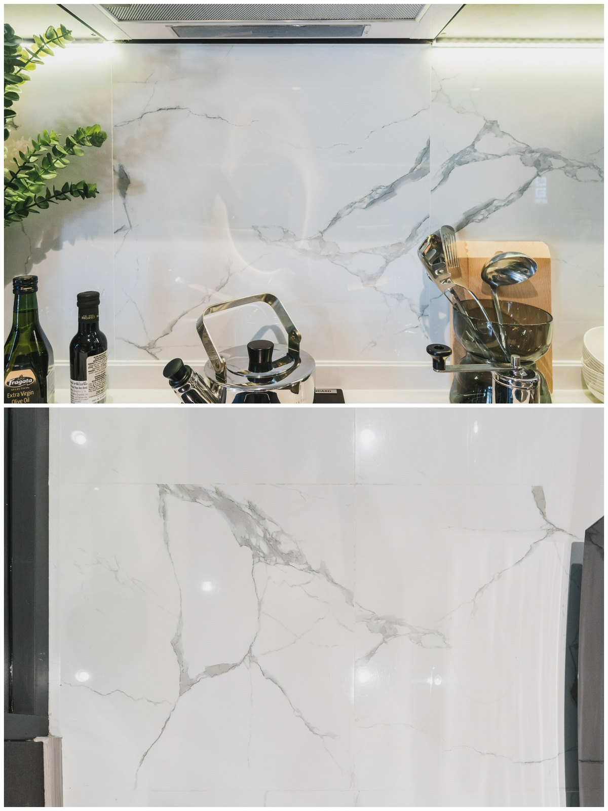Backsplash ที่ทางโครงการกรุมาให้จะเป็น ‘กระเบื้องลายหินอ่อนสีขาว’ ลวดลายเดียวกับพื้นครัว ทำให้มีความเชื่อมโยงกันของสีสัน และลวดลาย ห้องครัวนี้จึงดูสวยงาม ทั้งยังช่วยให้การเช็ดล้างทำความสะอาดหลังงานครัวนั้นง่ายขึ้นอีกด้วย