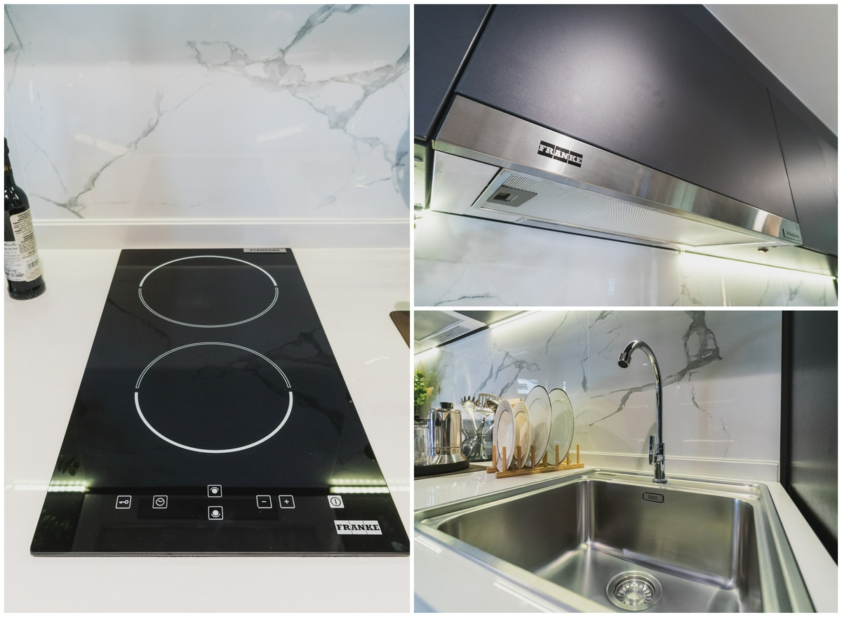 บริเวณ Top ครัวจะยังคงได้เป็นวัสดุหินเทียม Geoluxe จาก SCG เช่นเดิม พร้อมทำ Backsplash กรุด้วยกระเบื้องลายหินอ่อน ลวดลายสวยงามเข้ากับพื้นครัว ทางฝั่งพื้นที่ใช้สอยก็ถือว่าพอเพียงต่อการใช้งานจริง มีพื้นที่สำหรับเตรียมอาหารอยู่ตรงกลาง สามารถวางจานชามได้สะดวก พร้อมด้วยเตาไฟฟ้า เซรามิก 2 หัว, เครื่องดูดควัน และซิงก์ล้างจานจากแบรนด์ Franke