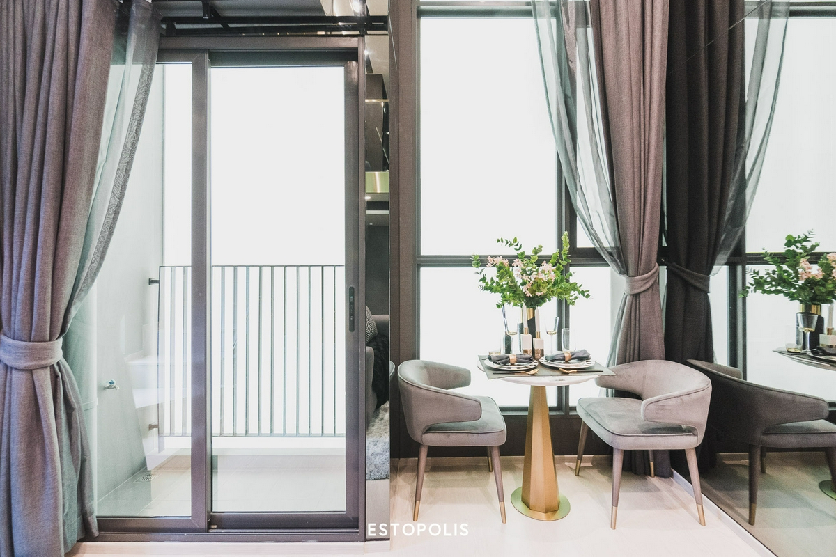 ใส่ความเป็นตัวเองด้วย ‘พื้นที่แบบเข้ามุม’ ที่อยู่ติดกับระเบียง เหมาะสำหรับใช้วางโต๊ะทานข้าวสำหรับ 2 ที่ หรือจะออกแบบเป็นโต๊ะบาร์หันออกนอกหน้าต่าง ไว้นั่งชมวิวเมืองก็ให้ความเป็นส่วนตัวสุด ๆ โดยบริเวณด้านบนสุดจะติดตั้งเครื่องปรับอากาศขนาด 24,000 BTU จากแบรนด์ Daikin เอาไว้ให้