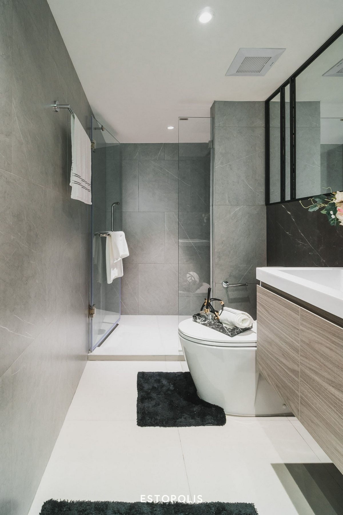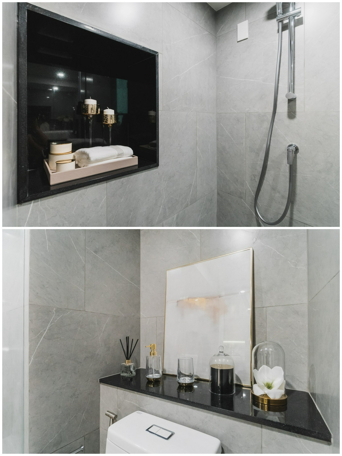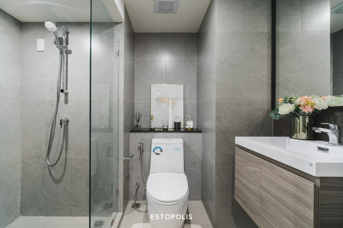 - พื้นและผนังกรุด้วยกระเบื้องอย่างดี ดูเรียบหรู และโมเดิร์นด้วยโทนสีเทาขาว