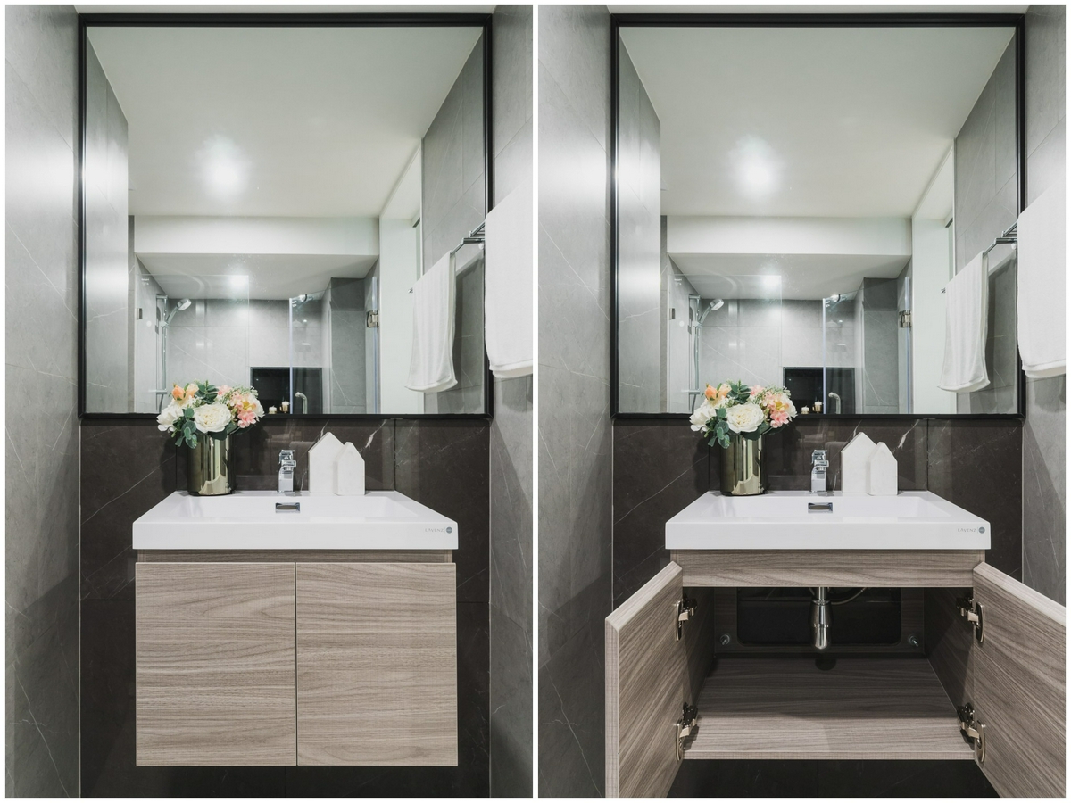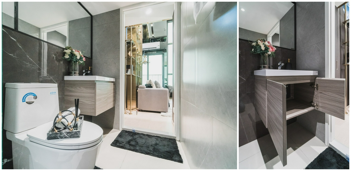 ‘เคาน์เตอร์อ่างล้างหน้า’ สามารถเปิดออกใช้เป็นพื้นที่เก็บของ เพื่อเพิ่มความเป็นระเบียบเรียบร้อยให้กับห้องน้ำwfh โดยตัวอ่างจะเป็นของแบรนด์ Lavenz, ก๊อกน้ำแบรนด์มาตรฐานจาก American Standard เช่นเดียวกับห้อง Type แรก