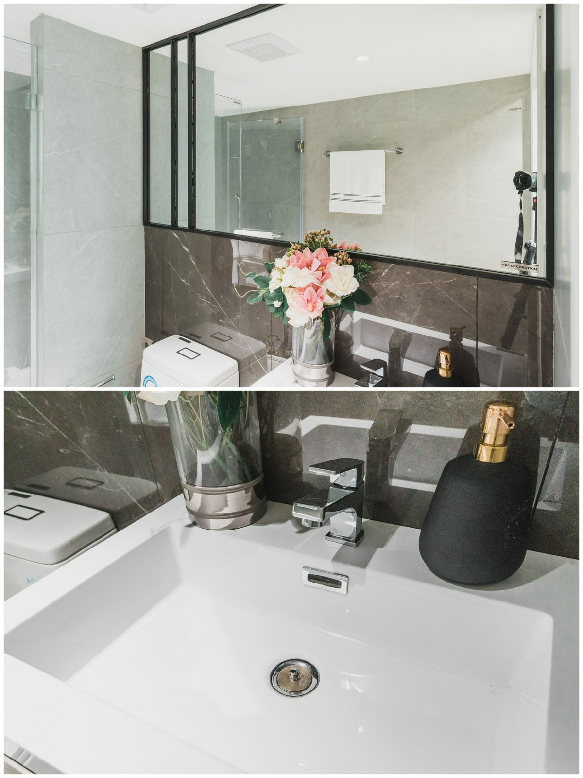ขยับเข้าไปยัง “ห้องน้ำ” ซึ่งจะมีลักษณะแบบหน้ากว้าง เมื่อเปิดเข้ามาจะเจอ Shower Box อยู่ทางซ้ายมือ และจะมีพื้นที่ส่วนแห้งอย่าง โถสุขภัณ์แบรนด์ American Standard และอ่างล้างหน้า พร้อมด้วยกระจกเงาขนาดใหญ่อยู่ทางฝั่งตรงข้าม