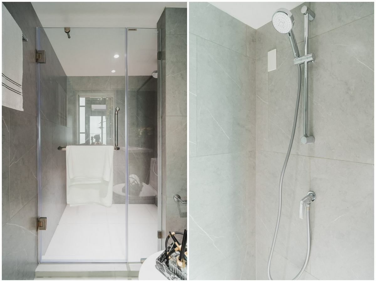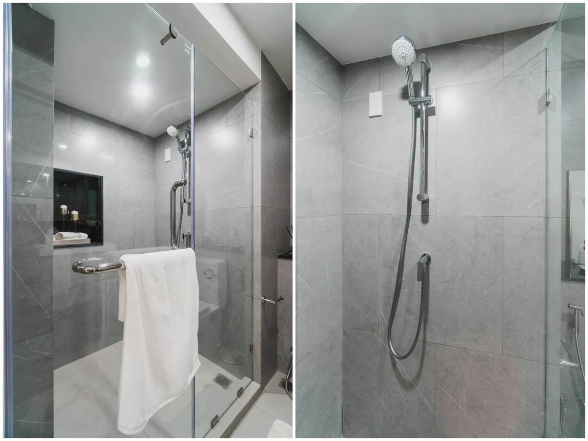 ด้านหน้า Shower Box ติดตั้งบาน Partition เป็นประตูกระจกที่มีราวจับใช้แขวนผ้าขนหนูได้ ด้านในติดฝักบัวแบบ Hand Shower จากแบรนด์ Grohe ส่วนพื้นที่ใช้งานก็มีขนาดกว้าง สามารถติดตั้งชั้นวางของเพิ่มเติมได้โดยไม่กินพื้นที่