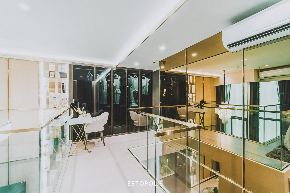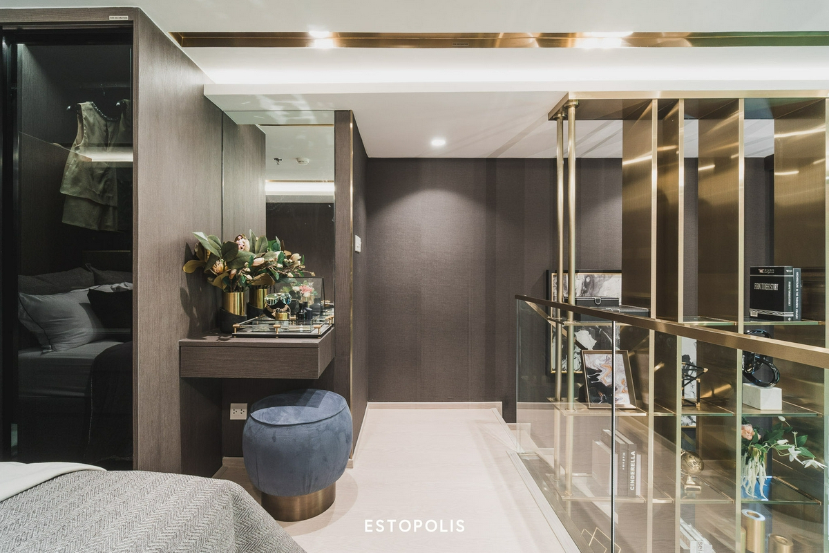 ปิดท้ายด้วยพื้นที่พักผ่อนส่วนสุดท้ายอย่าง “ห้องนอนบนชั้นลอย” เมื่อเราเดินขึ้นมาด้านบนจะเจอพื้นที่โล่งกว้างอยู่ถัดจากตู้เสื้อผ้าเข้าไป ให้เราสามารถจัดตกแต่ง ออกแบบเป็นโต๊ะเครื่องแป้งเช่นเดียวกับในห้องตัวอย่างได้เหลือเฟือ