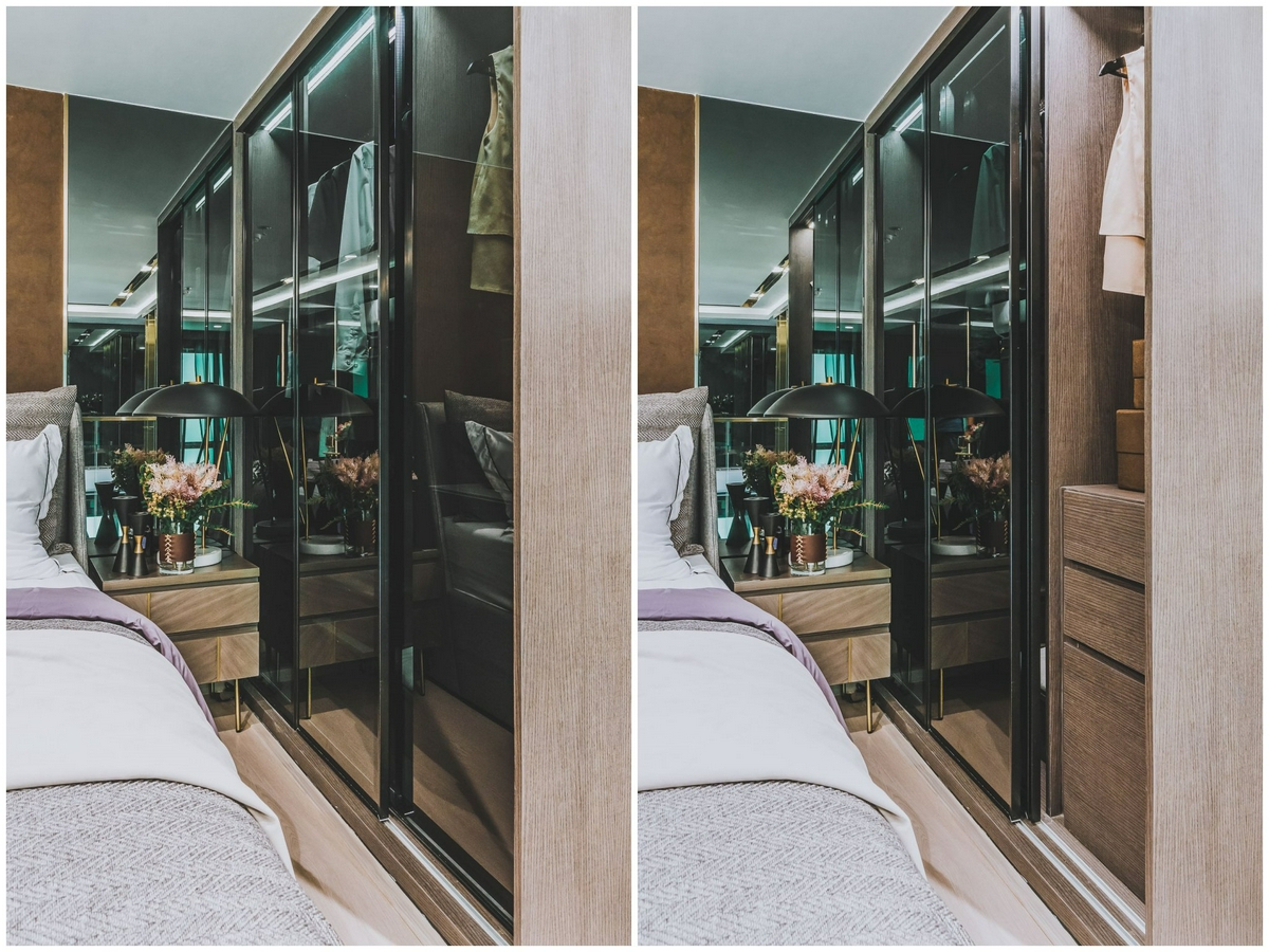 ส่วนพื้นที่ข้างเตียงจะมีตู้เสื้อผ้า Built in ที่ทางโครงการตกแต่งไว้ให้ โดยหน้าบานจะปิดด้วยลามิเนต พร้อมติดกระจกเงาไว้ให้เราใช้ส่องความเรียบร้อยได้สะดวกอีก 1 บาน ภายในตู้แบ่งพื้นที่จัดเก็บครบทั้งราวแขวนผ้า และลิ้นชัก จึงช่วยให้การจัดเก็บข้าวของเครื่องใช้ดูเป็นระเบียบ และสามารถใช้สอยส่วนต่าง ๆ ได้อย่างมีประสิทธิภาพยิ่งขึ้น