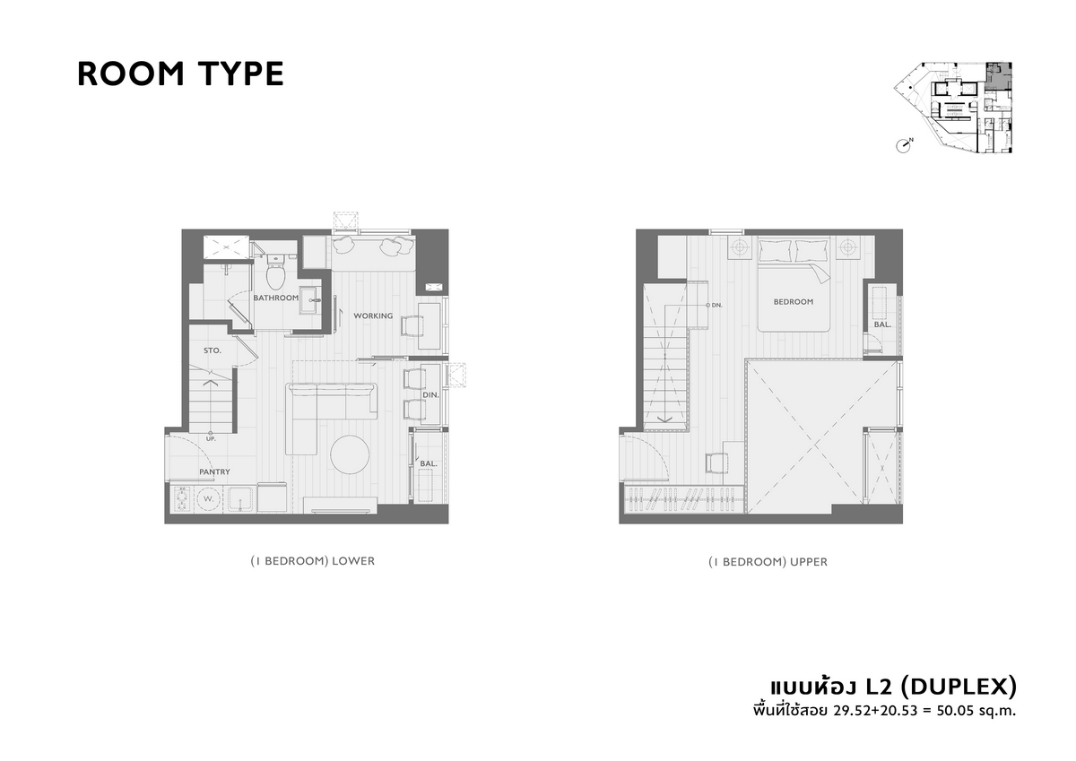 คราวนี้มาดูห้อง Duplex 1 Bedroom Plus 50.05 SQ.M. กันบ้าง โดยแปลนห้องจะมีลักษณะเป็นสี่เหลี่ยมจัตุรัส ง่ายต่อการตกแต่ง พร้อมแบ่งพื้นที่ใช้สอยภายในออกเป็น 2 ส่วน ได้แก่ ‘ชั้นล่าง ขนาด 29.52 ตารางเมตร’ และ ‘ชั้นบน ขนาด 20.53 ตารางเมตร’
