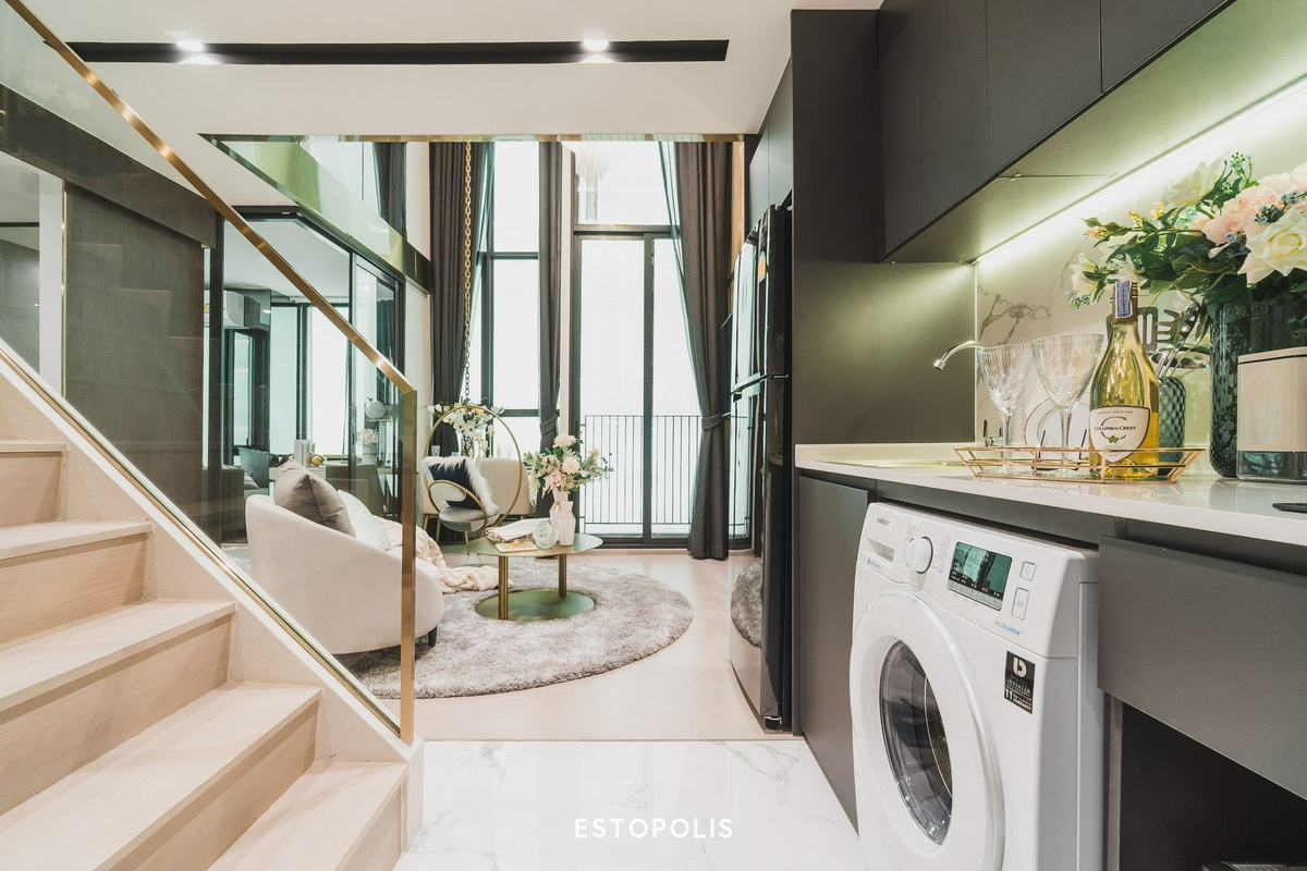 เมื่อเข้ามาในห้อง Duplex 1 Bedroom Plus 50.05 SQ.M. ส่วนแรกที่เราได้เจอจะเป็น ‘บันไดขึ้นไปยังชั้นบน’ ซึ่งถูกติดตั้งไว้ทางซ้ายมือ คู่กับเคาน์เตอร์ครัวทางด้านขวาในลักษณะของ “ครัวเปิด” โดยบริเวณนี้จะมีความสูงจากพื้นถึงเพดานอยู่ที่ 2.40 เมตร