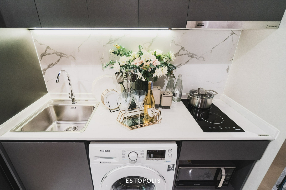 ในส่วนของการตกแต่งพื้น-ผนัง และอุปกรณ์ชุดครัวทั้งหมด จะได้วัสดุที่มีคุณภาพเป็นมาตรฐานเดียวกันกับห้อง Heighten 1 Bedroom 25.55 SQ.M. ซึ่งทางโครงการก็ได้ออกแบบ และปรับขนาดครัวให้เหมาะสมกับตัวห้อง เพื่อเป็นการเพิ่มพื้นที่ใช้สอยส่วนอื่น ๆ ให้มีขนาดกว้างขวางมากขึ้น โดยจะยังคงความครบครับของพื้นที่จัดเก็บเอาไว้ จึงหมาะสำหรับคนที่ชอบทำครัวเบา ๆ นั่นเอง