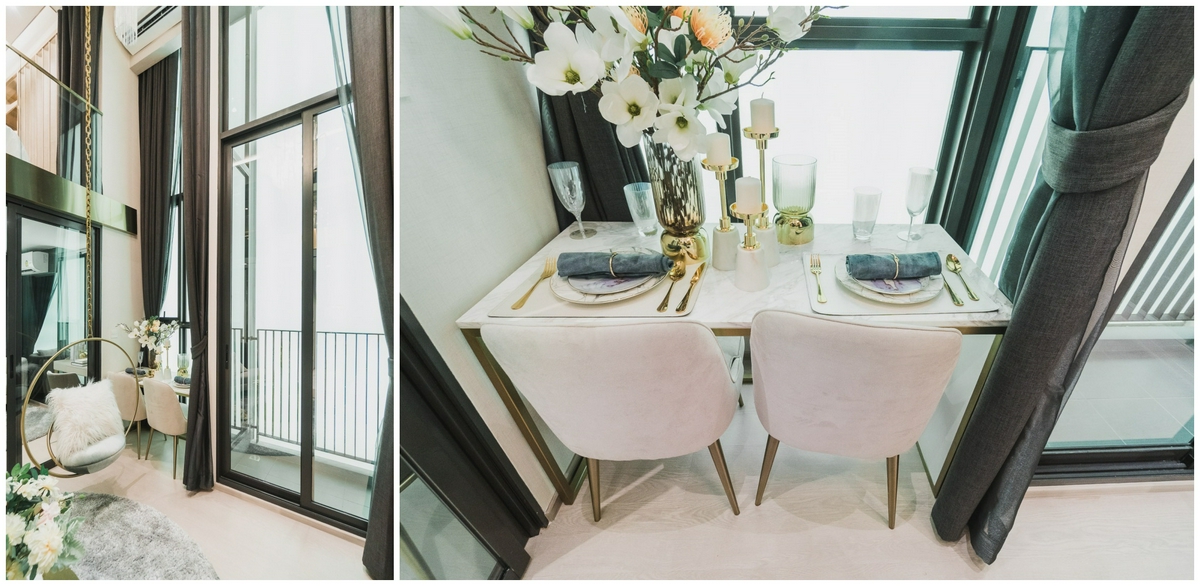 ติดกับประตูระเบียงจะยังมีมุมเล็ก ๆ ที่พอเหมาะสำหรับการวางโต๊ะทานข้าว ไม่ว่าจะจัดแบบเก้าอี้คู่หันหน้าเข้าหากัน หรือทำเป็นเคาน์เตอร์บาร์ไว้นั่งมองวิวเพลิน ๆ ด้านนอกก็เลือกได้ตามใจ หรือใครจะเปลี่ยนเป็นมุมทำงาน นั่งอ่านหนังสือก็สามารถครีเอทได้เช่นกัน