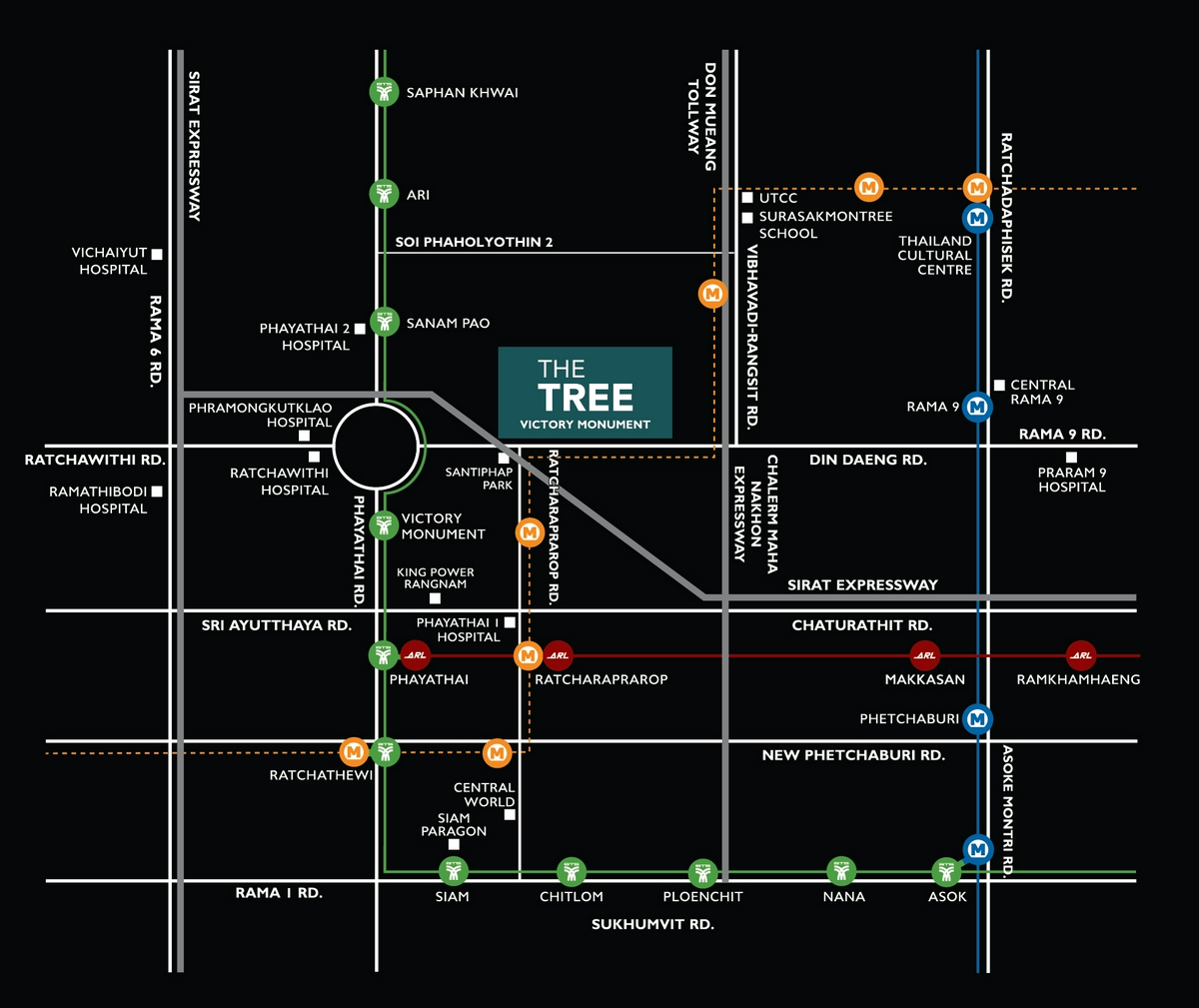 โครงการ The Tree Victory Monument ตั้งอยู่ใกล้กับสถานีรถไฟฟ้า BTS อนุสาวรีย์ชัยสมรภูมิ 700 เมตร ซึ่งถือว่าเป็น… โครงการที่ตั้งอยู่ใจกลาง HUB ของการคมนาคม และระบบขนส่งหลักในตัวเมือง ทำให้คุณสามารถเดินทางเข้าไปยังศูนย์กลางของกรุงเทพมหานครได้รอบด้านทั้ง 4 ทิศ เหนือ-ใต้-ออก-ตก พร้อมมีจุดขึ้น-ลงทางพิเศษศรีรัช, ทางพิเศษเฉลิมมหานคร และทางยกระดับอุตราภิมุข ซึ่งเป็นตัวช่วยสำคัญในการเชื่อมต่อเข้าสู่ทุก ๆ มุมเมืองของกรุงเทพฯ แถมยังสะดวกง่ายดายด้วยรูปแบบการเดินทางที่หลากหลาย ครบวงจร ทั้งรถไฟฟ้า, รถตู้, รถเมล์ และในอนาคตก็กำลังจะมี รถไฟฟ้าสายสีส้ม ตัดผ่านเข้ามาในบริเวณนี้เพิ่มอีกด้วย