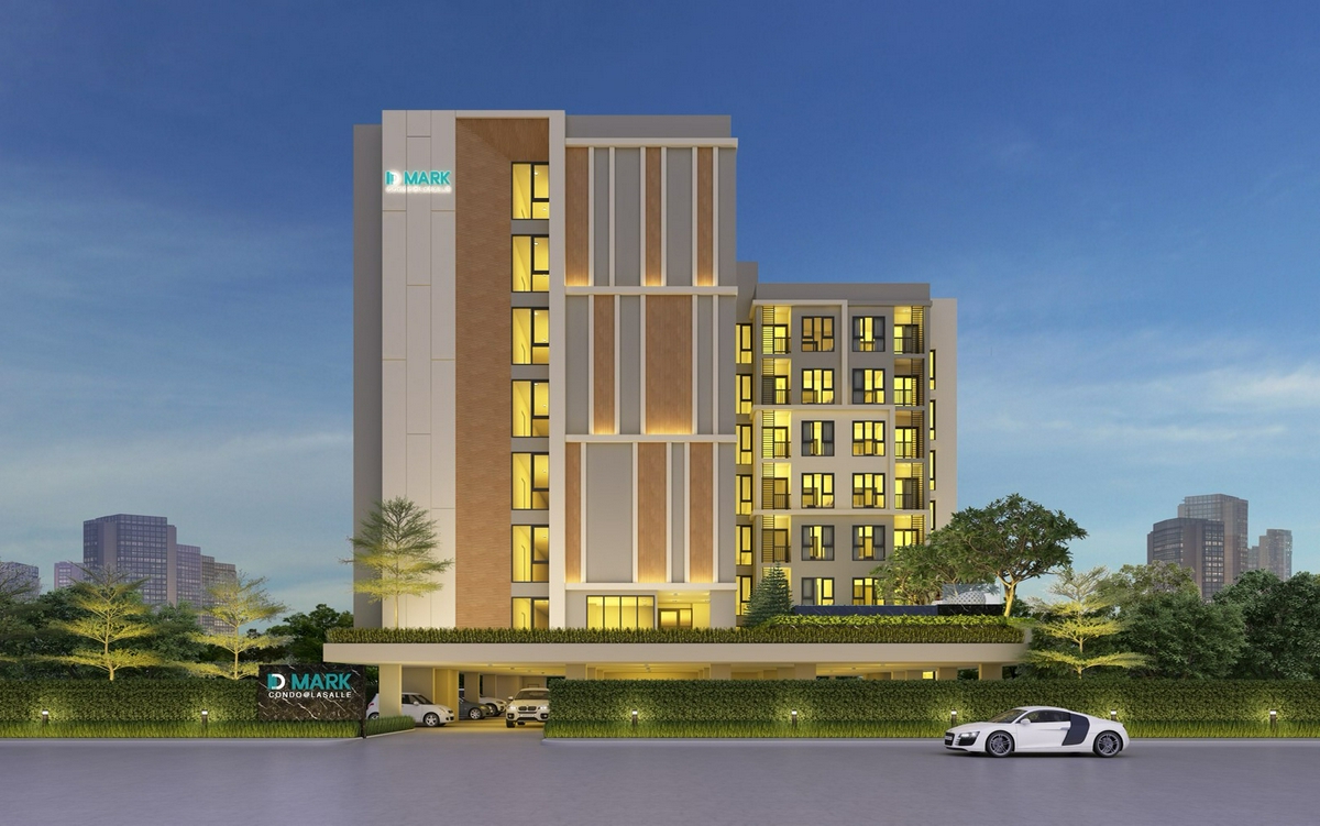 โครงการ D Mark Condo @ Lasalle ตั้งอยู่ติดกับถนนภายในซอยลาซาล 8 ดังนั้น ห้องพักบริเวณฝั่งด้านหน้าทางเข้าโครงการ จึงออกแบบแบบปิดทึบเพื่อเพิ่มความเป็นส่วนตัว โดยจะเว้นช่องตรงบานหน้าต่างส่วนคอริดอร์ไว้ ทำให้คนที่เลือกอยู่อาศัยห้องริมติดถนน ก็จะได้รับความเป็นส่วนตัวเพิ่มขึ้นนั่นเอง ส่วนการออกแบบโดยรวมของอาคารจะเน้นความเรียบง่าย โมเดิร์นทันสมัย ไม่หวือหวา ใช้โทนสีอบอุ่นให้ความรู้สึกเป็นเรสซิเดนเชียลมากยิ่งขึ้น