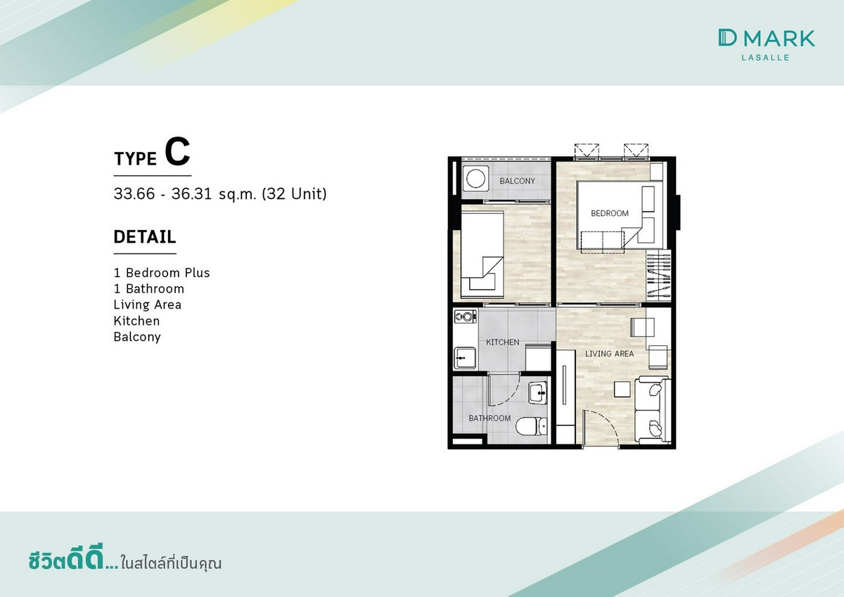 TYPE C : 1 Bedroom Plus ขนาด 33.66 - 36.31 ตร.ม.