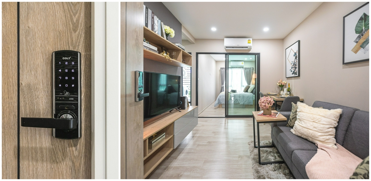 เริ่มต้นสแกนประตู ‘Digital Door Lock’ ที่ทางโครงการ D Mark Condo @ Lasalle ติดตั้งมาให้ เพื่อเชื่อมเข้าสู่ห้องพักอาศัยของเรากันเลย เมื่อเปิดเข้ามาแล้วเราก็ได้จะพบกับส่วนของห้องนั่งเล่นก่อนเป็นลำดับแรก ถัดไปจึงจะเป็นส่วนของห้องนอน Master Bedroom ที่กั้นด้วยประตูกระจกบานเลื่อน