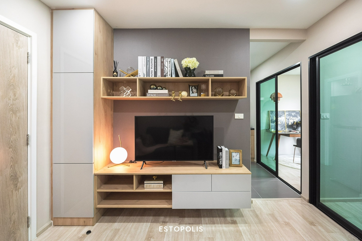 ทางด้านของ ‘ชั้นวางทีวี’ ก็จะได้เหมือนกับห้อง Type แรกทุกประการ ซึ่งจะมีพื้นที่จัดเก็บเพียงพอต่อความต้องการ ไม่ว่าจะวางของตั้งโชว์ หรือจัดเก็บพวกหนังสือ, สิ่งของต่าง ๆ ก็เอาอยู่ โดยทางโครงการจะติดตั้ง Cable TV เอาไว้เรียบร้อย ให้เราสามารถจัดวางทีวีตั้งโต๊ะ หรือติดตั้งแบบแขวนผนัง เพื่อเพิ่มพื้นที่จัดวางได้สบาย ๆ และด้านใต้ของชั้นวางทีวีจะยกลอยขึ้นเหนือพื้น สามารถทำความสะอาดกวาดถูได้ง่ายดาย
