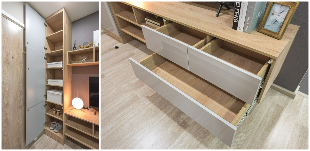ทางด้านของพื้นที่จัดเก็บภายในตู้บิลต์อินนี้ จะแบ่งเป็นชั้นสำหรับจัดเก็บทั้งหมด 7 ชั้น สามารถใช้งานได้ตามความต้องการ ไม่ว่าจะเป็นรองเท้า, กระเป๋า, เครื่องประดับ, แผ่นเกม, แผ่น DVD ต่าง ๆ ไปจนถึงด้านใต้ของชั้นวางทีวี ที่จะมีลิ้นชักมาให้ถึง 3 บาน พร้อมพื้นที่จัดเก็บด้านข้างอีก 3 ช่อง ทำให้เราสามารถใช้วางเครื่องเล่น และจัดเก็บข้าวของต่าง ๆ ได้อย่างเป็นระเบียบ และเพียงพอแน่นอน