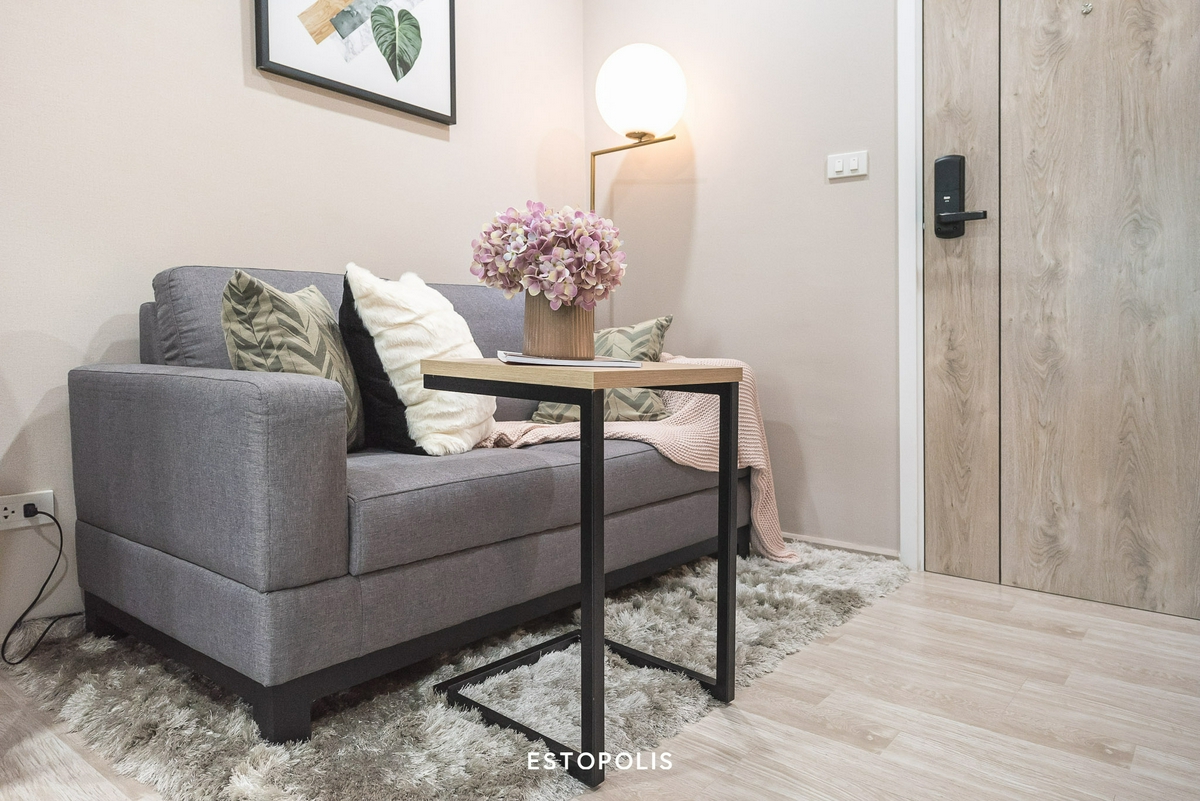 นอกจากนี้ ทางโครงการ D Mark Condo @ Lasalle ยังจัดชุดโซฟานั่งเล่น ขนาดพอดีมุมน่ารัก ๆ มาให้ 1 ชุด อยู่ฝั่งตรงข้ามกับชั้นวางทีวี เอาไว้ให้เรานั่งดูรายการทีวีโปรดได้แบบชิลล์ ๆ