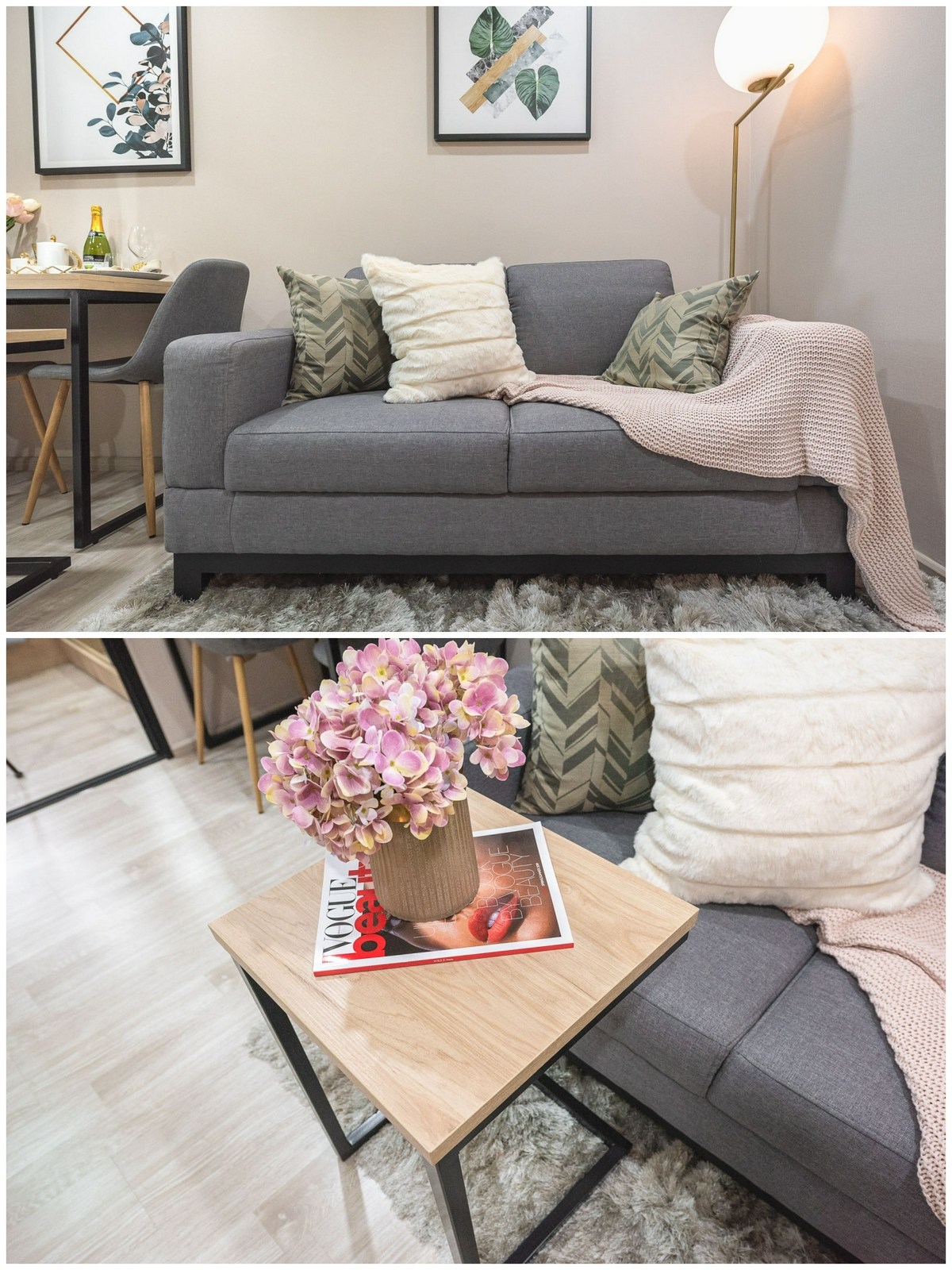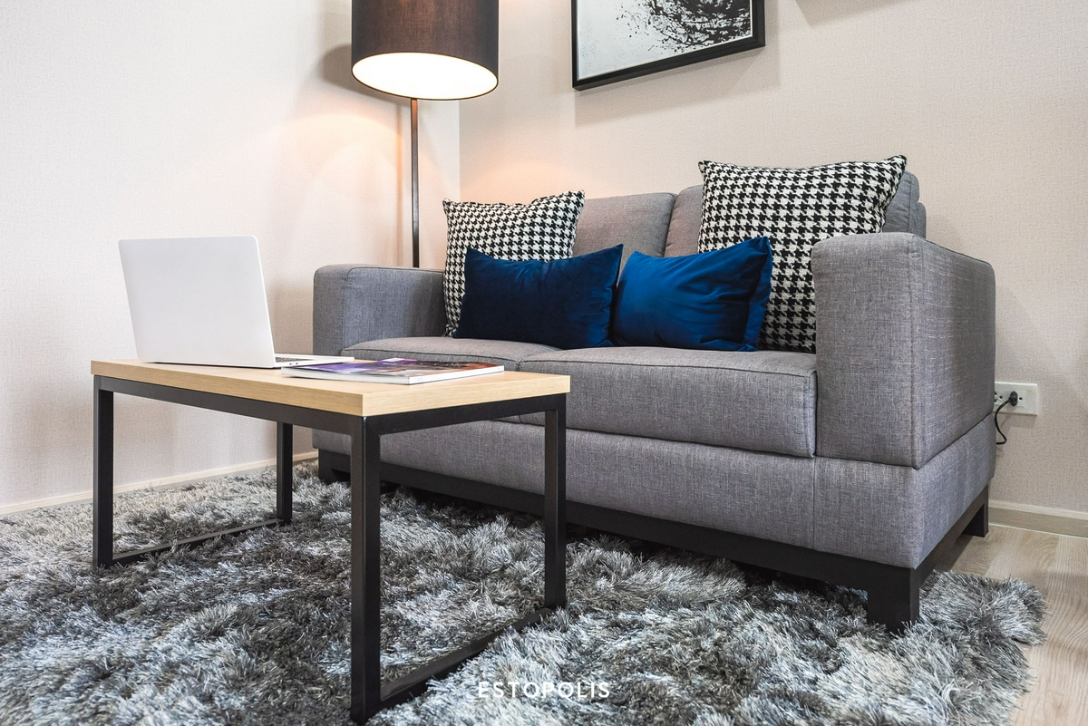 โดยส่วนนี้เราจะได้เป็น ‘โซฟาขนาด 2 ที่นั่ง’ วัสดุผ้าสีเทาเข้ม มีความเรียบง่ายสไตล์โมเดิร์น มาพร้อม ‘โต๊ะกลาง’ แบบคร่อมที่นั่ง ทำให้เราสามารถเคลื่อนย้ายเข้าออกได้อย่างสะดวก เหมาะจะใช้วางโน้ตบุ๊กขณะทำงาน, วางหนังสือสำหรับอ่านเล่น หรือจะใช้วางอาหารสำหรับนั่งทานเพลิน ๆ บนโซฟา พร้อมรับชมรายการโปรดก็ได้เช่นกัน