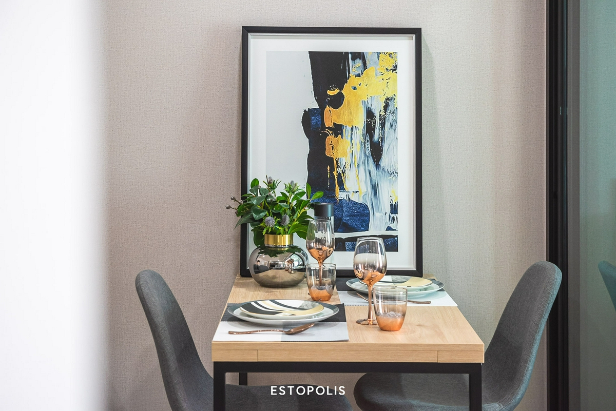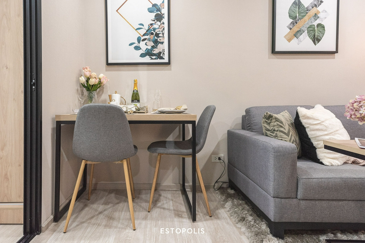 ติดกับส่วนนั่งเล่นจะเป็นมุมทานข้าวเล็ก ๆ ที่มาพร้อม ‘โต๊ะทานอาหาร’ และ ’เก้าอี้นั่งอีก 2 ตัว’ ซึ่งเราสามารถจัดวางตำแหน่งได้ตามใจชอบ ไม่ว่าจะหันเก้าอี้เข้าหาทีวีทั้ง 2 ตัว หรือใครที่อยู่คนเดียวก็อาจดัดแปลงส่วนนี้ เป็นมุมนั่งทำงานเล็ก ๆ ก็ยังได้