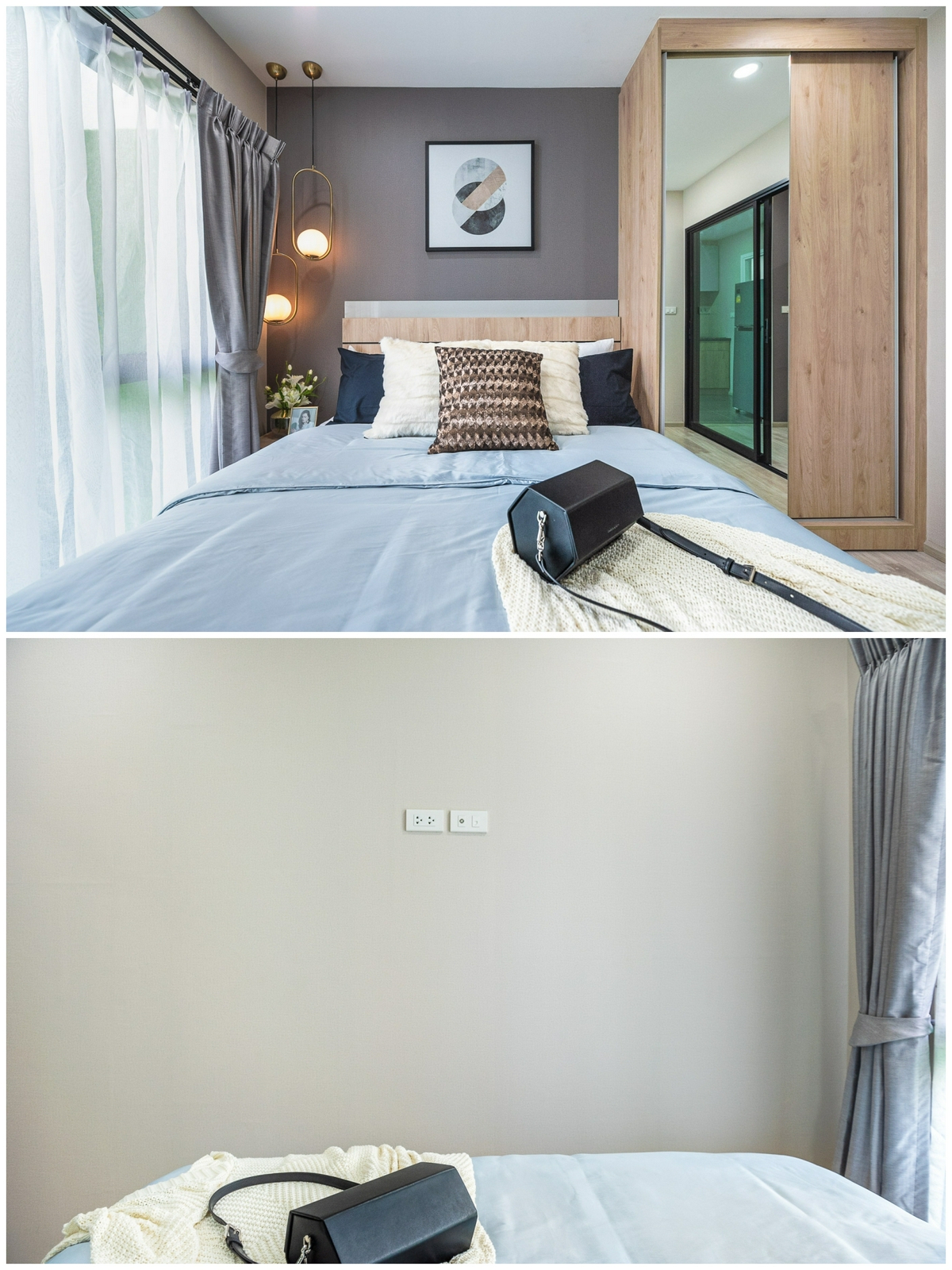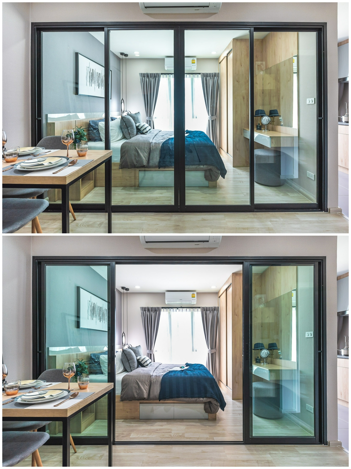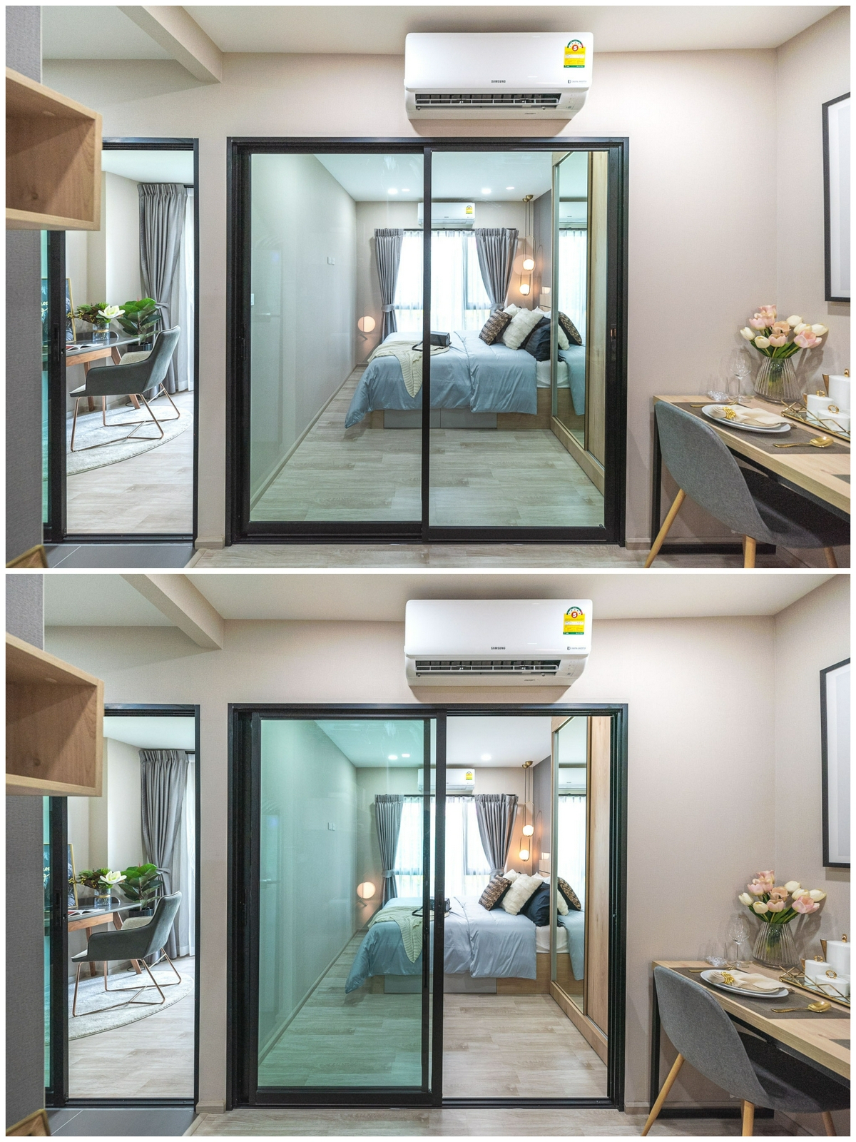 มาสำรวจต่อที่ ‘ห้องนอน’ กันบ้าง โดยพื้นที่ส่วนตัวนี้จะกั้นปิดด้วยประตูกระจกบานสไลด์ 4 ตอน สามารถเปิดบานตรงกลางออกได้พร้อมกันทั้ง 2 บาน ทำให้บรรยากาศห้องดูใหญ่กว่าห้อง Type แรกเล็กน้อย