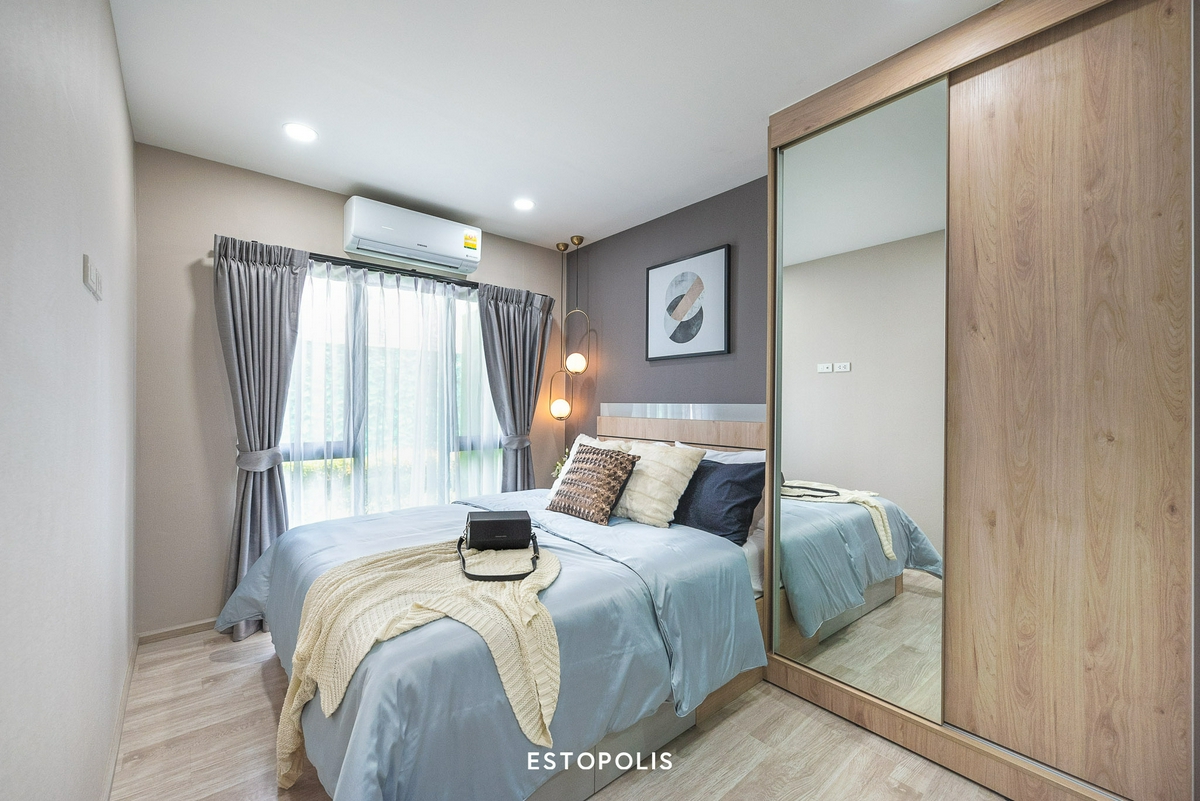 ภายในห้องจะเจอ ‘ฐานเตียงขนาดใหญ่ 5 ฟุต’ ตั้งอยู่ ส่วนบริเวณปลายเตียงจะเป็น ‘ตู้เสื้อผ้า’ ขนาดใหญ่พร้อม ’โต๊ะเครื่องแป้ง’ ด้านในสุดของห้องนอกนจะกรุกระจกใสบางสูงคู่กับ ‘เครื่องปรับอากาศอีก 1 เครื่อง’ อยู่เหนือบานหน้าต่างนั่นเอง