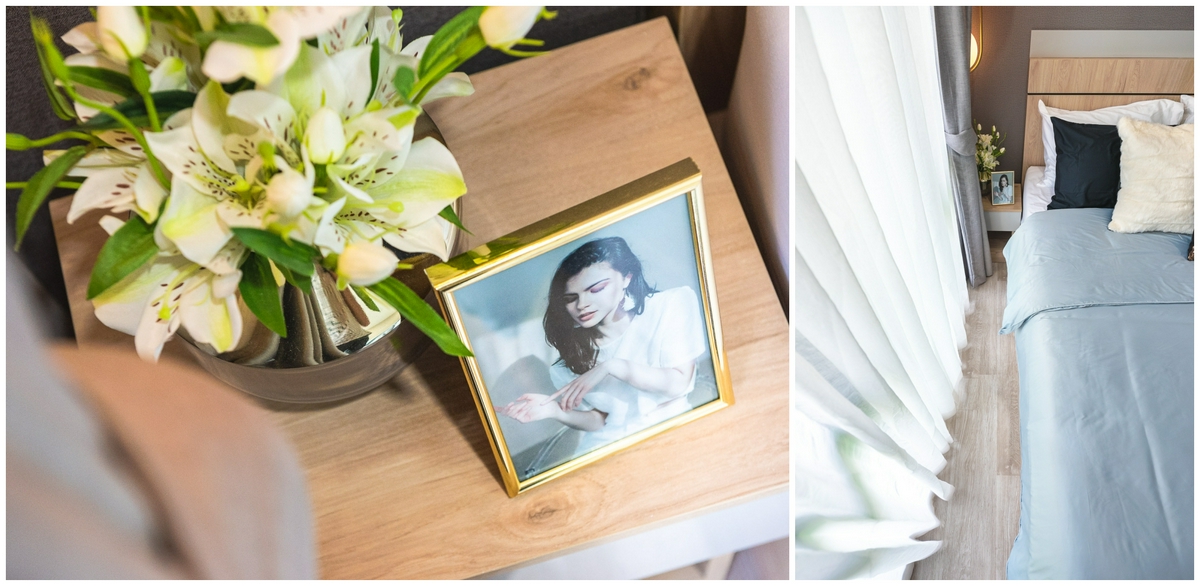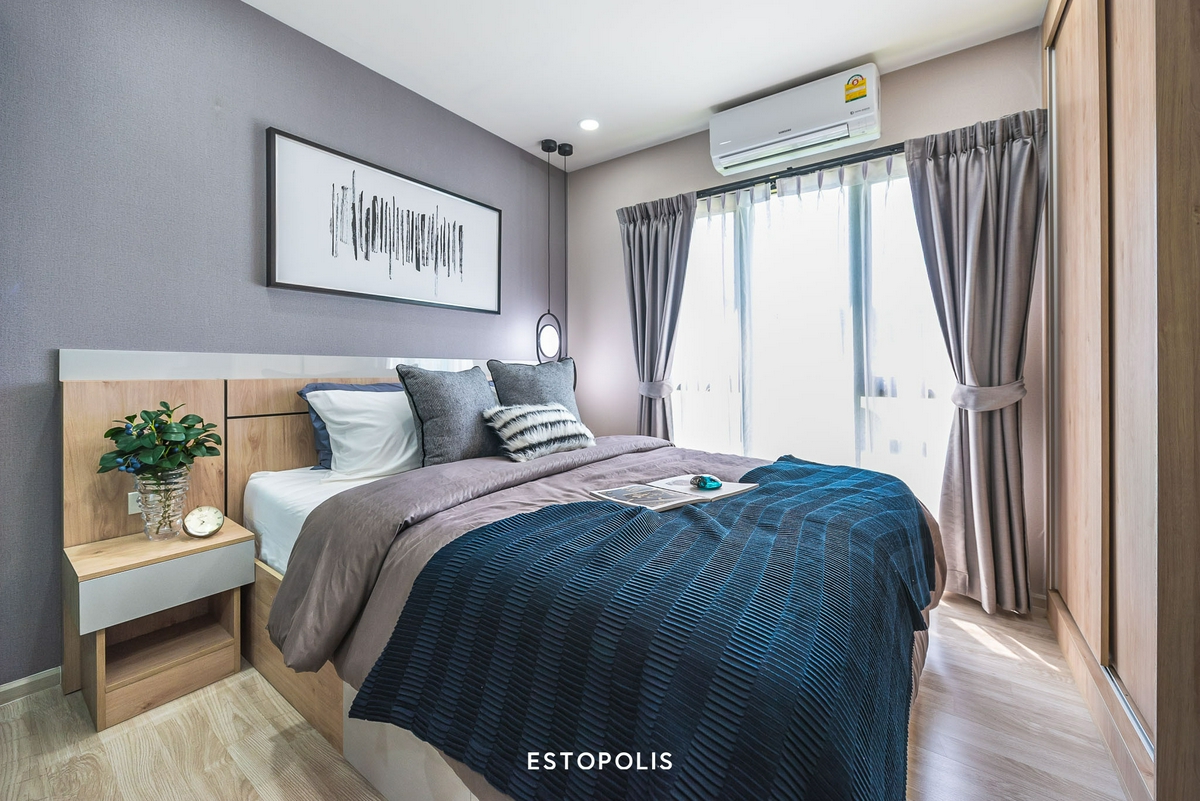 ติดกับหน้าต่างก็จะมี ‘โต๊ะหัวเตียง’ สำหรับวางโคมไฟ, นาฬิกาปลุก, แว่นตา, หนังสืออ่านก่อนนอน ฯลฯ ที่ทางโครงการให้มาด้วย เรียกว่าสะดวกสบายมาก ๆ สำหรับการใช้งานในชีวิตประจำวัน อีกทั้งพื้นที่รอบเตียงก็ยังเดินเข้า-ออกสะดวก สามารถใช้งานได้ลื่นไหล ไม่คับแคบจนเกินไป