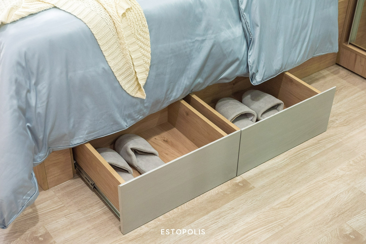 นอกจากนี้ ฐานเตียงก็ยังซ่อนความเก๋ด้วยลิ้นชัก 2 บาน มาช่วยเพิ่มพื้นที่จัดเก็บ ไม่ว่าจะใช้เก็บชุดนอน, ถุงเท้า หรือเสื้อชั้นในต่าง ๆ ก็สามารถหยิบใช้งานได้สะดวก ทำให้ชีวิตประจำวันของเรานั้นง่ายขึ้น