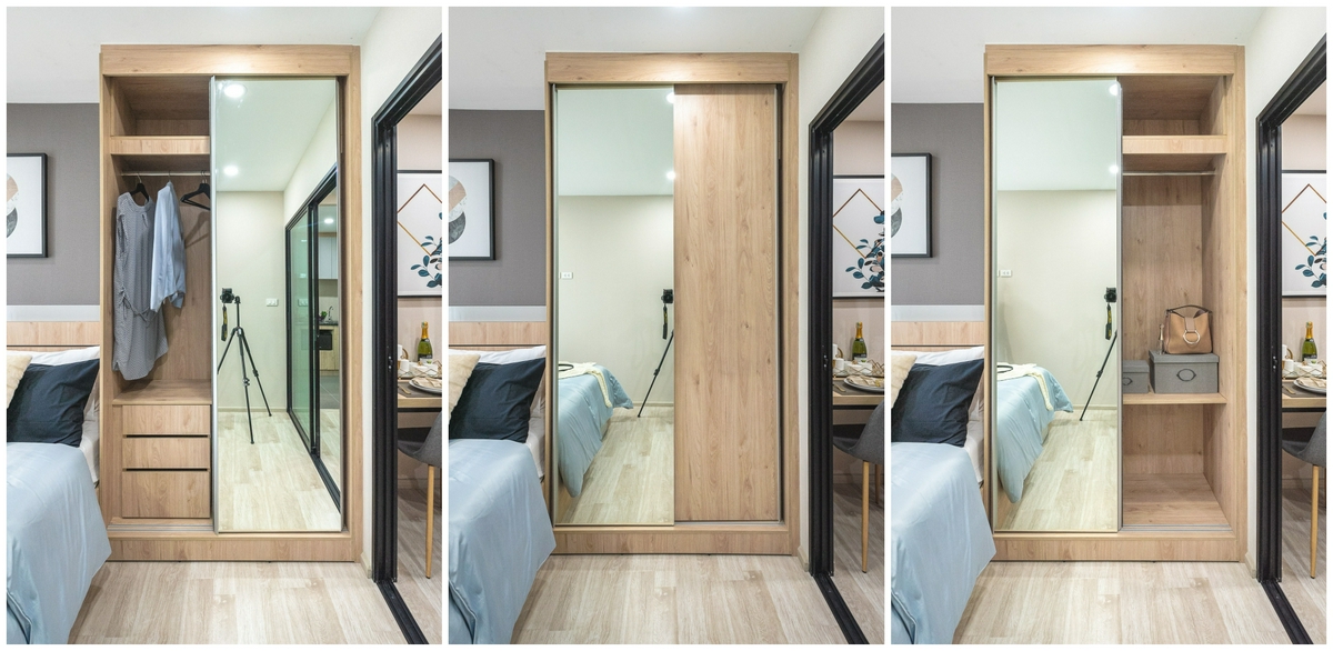 ทางด้าน ‘ตู้เสื้อผ้า’ ที่ทางโครงการบิลต์อินมาให้นั้น ก็มีขนาดใหญ่จัดเต็ม เรียกว่าสูงจากพื้นถึงเพดานกันเลยทีเดียว โดยหน้าบานตู้ข้างหนึ่งจะติดกระจกเงาให้ สำหรับใช้ส่องดูความเรียบร้อยของเราก่อนออกจากห้อง ส่วนด้านในก็จะแบ่งสัดส่วนการจัดเก็บออกเป็น...