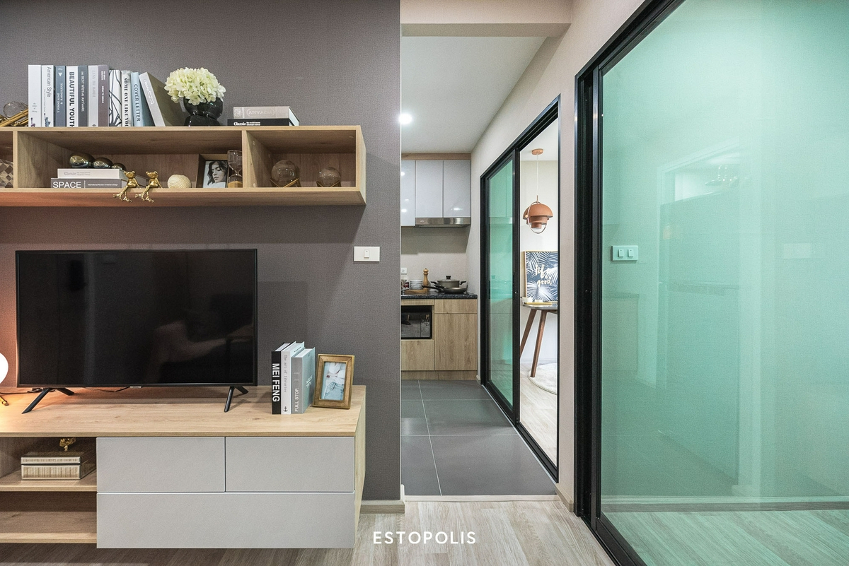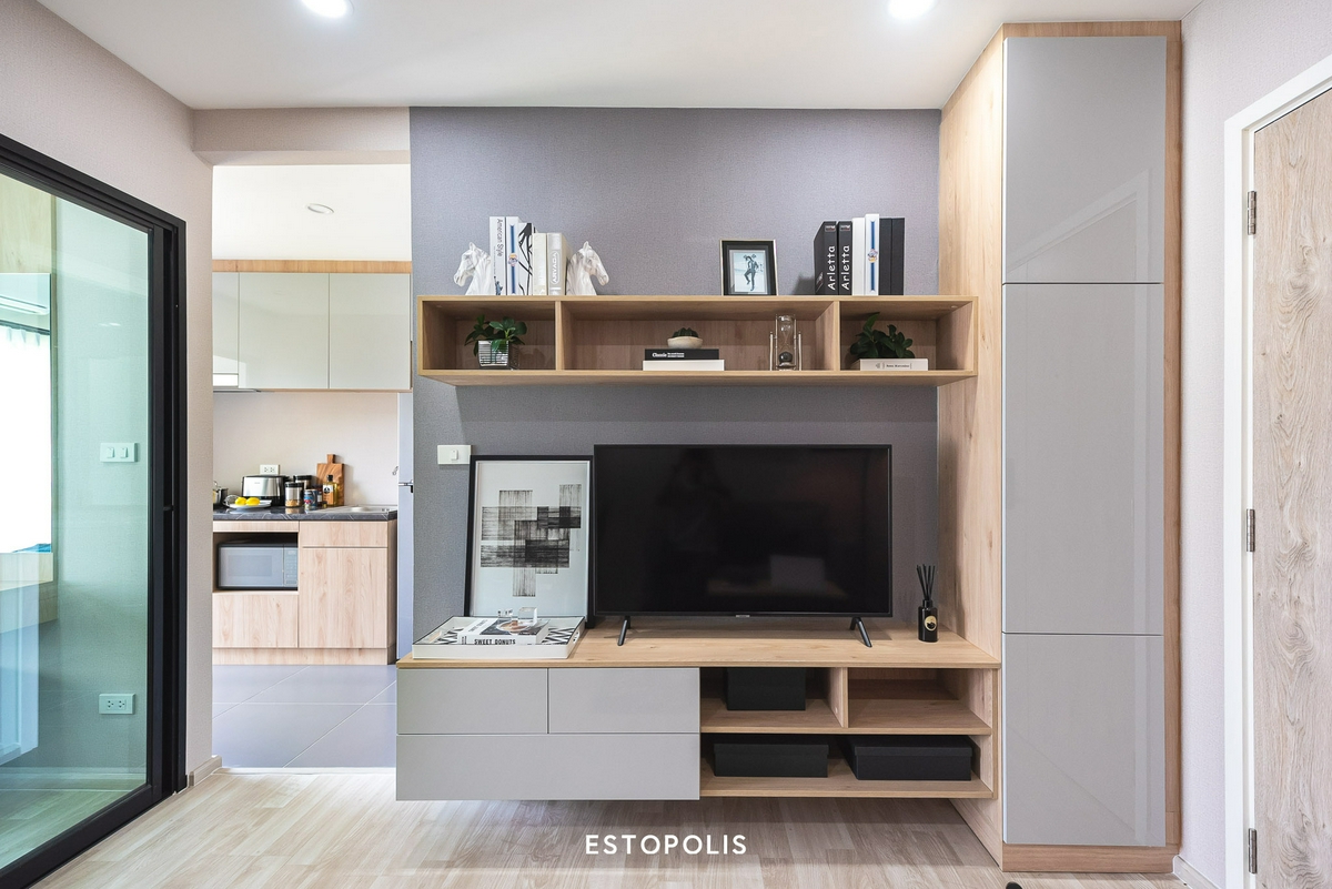 ซ้ายมือของประตูทางเข้า จะเป็นส่วนของ ‘ชั้นวางทีวีขนาดใหญ่’ ที่ทางโครงการบิลต์อินมาให้เป็นอย่างดี มีพื้นที่จัดเก็บทั้งด้านข้าง, ด้านล่าง และด้านบน พร้อมวางระบบ Cable TV เอาไว้ให้ สามารถติดตั้งใช้งานได้ทันที และถัดจากส่วนนี้ไปทางด้านหลังก็จะเป็นห้องครัว ที่มีห้องอเนกประสงค์อยู่ฝั่งตรงข้ามนั่นเอง