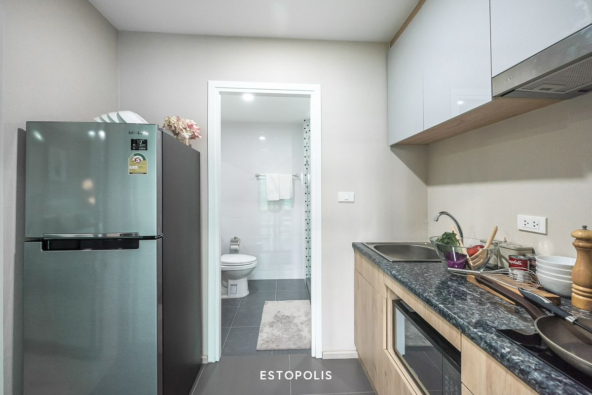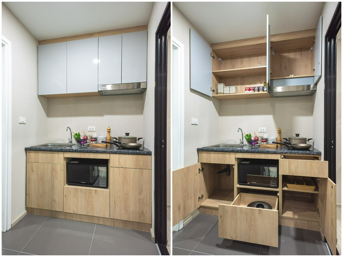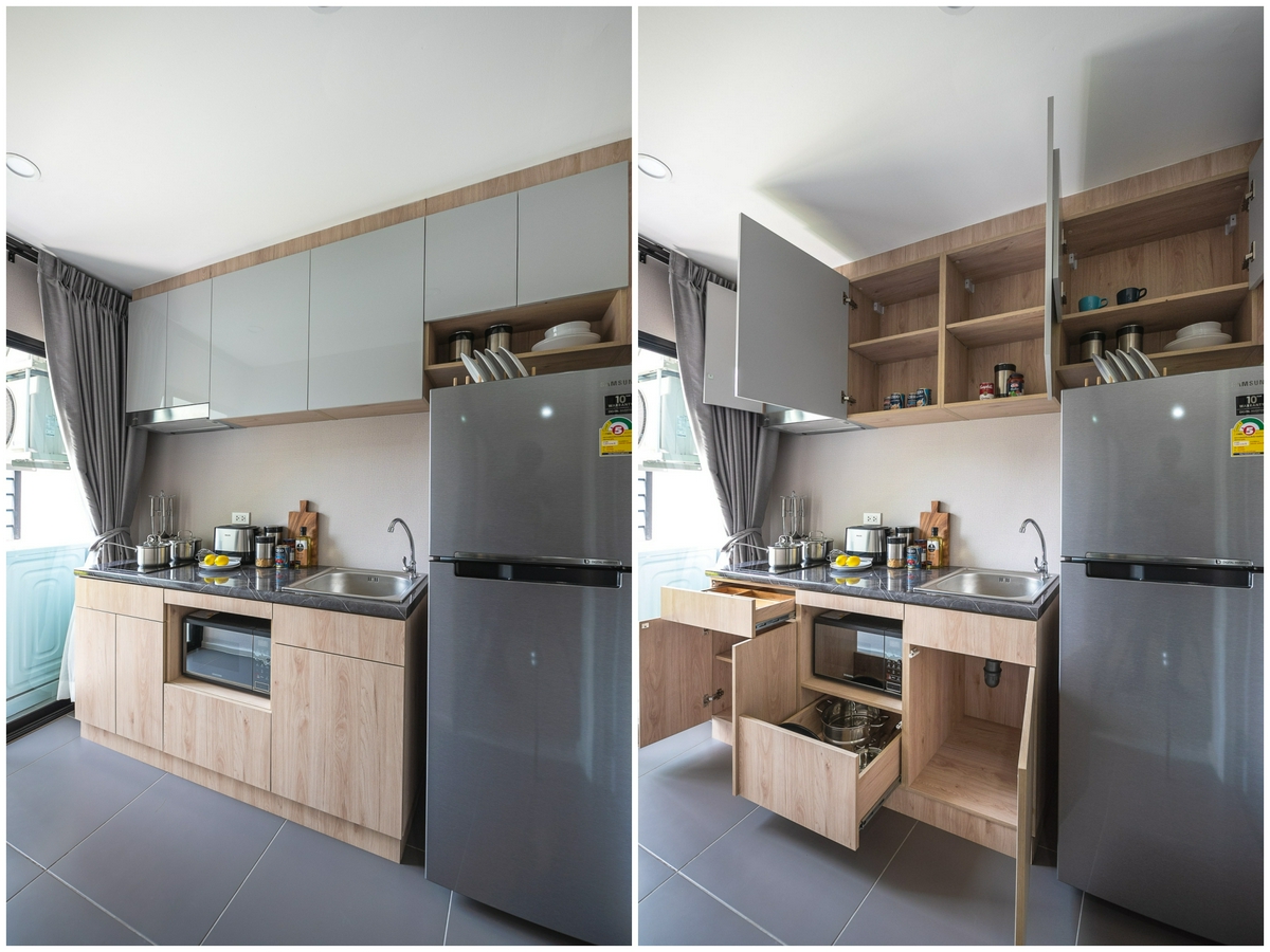 ในส่วนของ ‘ห้องครัว’ Type นี้จะมีลักษณะ และรูปแบบที่แตกต่างออกไปจากห้อง Type แรกเล็กน้อย โดยชุดครัวห้องนี้จะเพิ่มชั้นแขวนผนังมาให้อีก 2 หน้าบาน ส่วนด้านข้างก็จะเว้นที่ว่างสำหรับใช้วางตู้เย็นไว้ให้ด้วย
