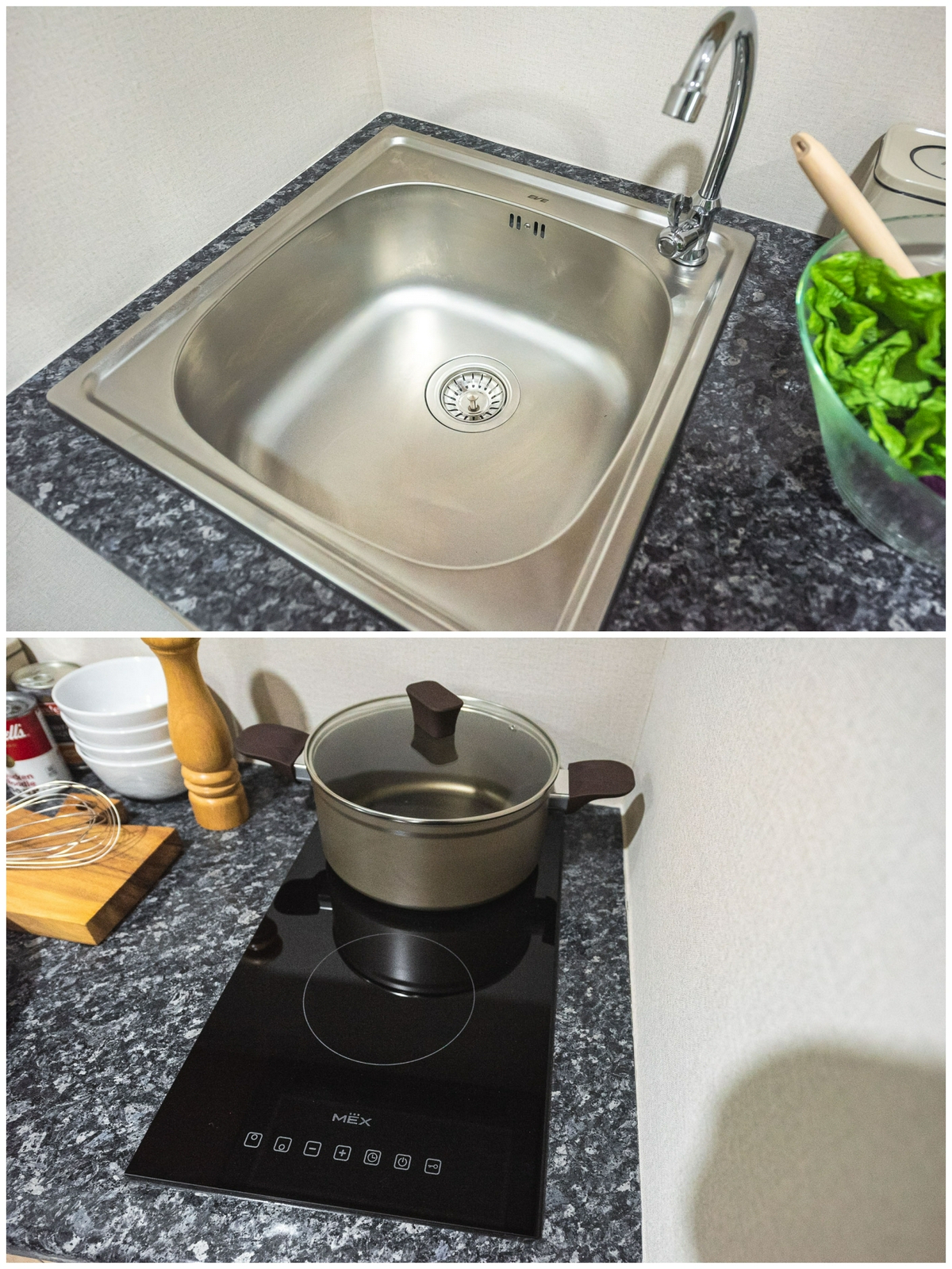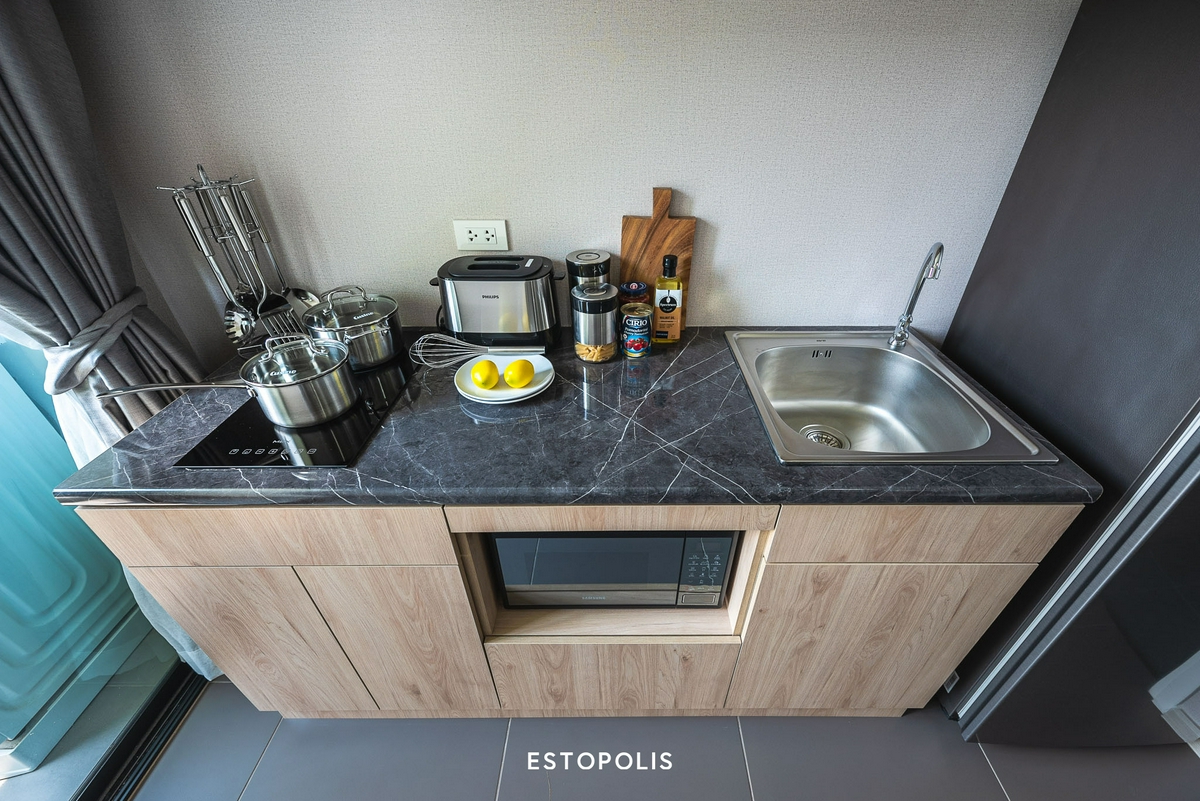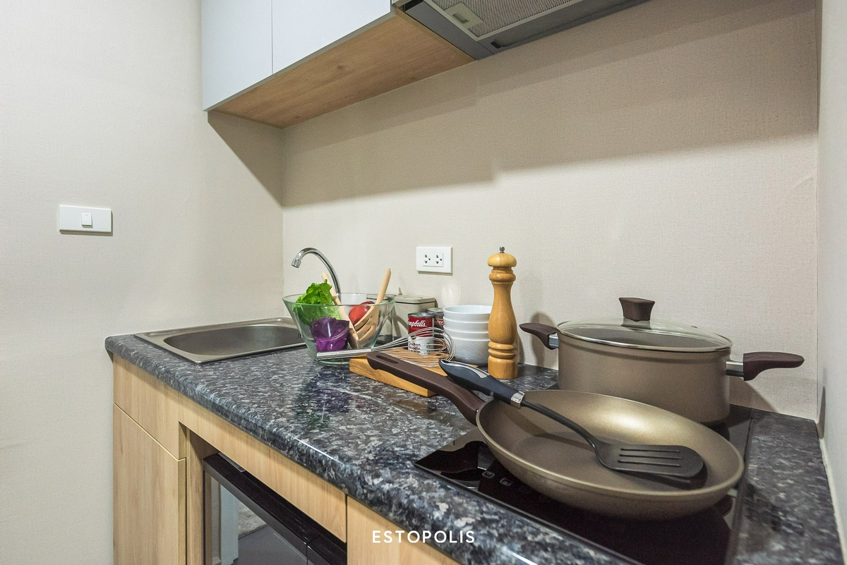นอกจากนี้ ทางโครงการยังให้ ‘เตาไฟฟ้า 2 หัวเตา’ กับ ‘เครื่องดูดควันระบบหมุนเวียน’ แบรนด์ MEX มาให้ด้วย เราจึงสามารถประกอบอาหารพร้อมกันได้ 2 เมนูในคราวเดียว ส่วนทางด้านของ ‘ซิงก์ล้างจาน’ และก็อกน้ำจะเป็นของแบรนด์ EVE มีขนาดพอเหมาะสำหรับการใช้งาน