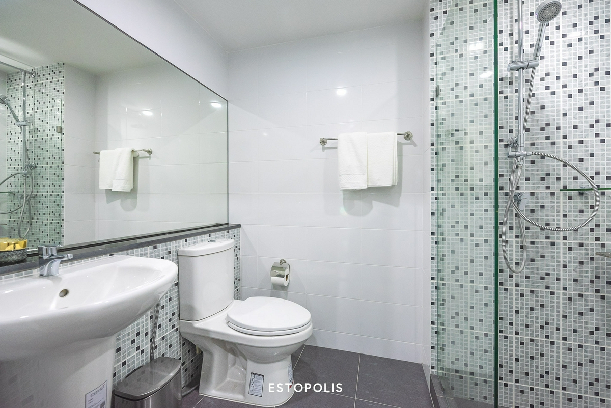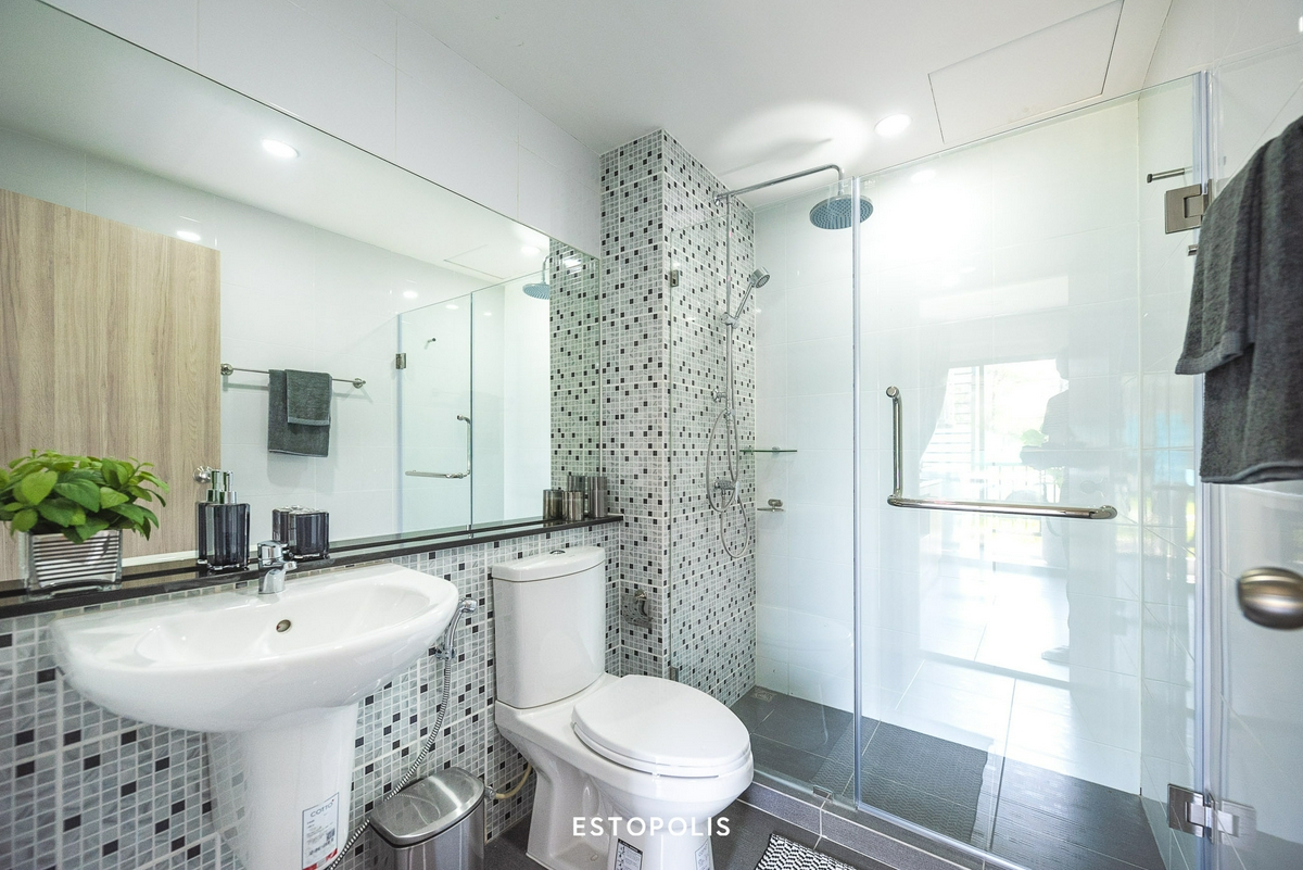 มาต่อกันที่ ‘ห้องน้ำ’ ที่เมื่อเปิดเข้ามาจะเจอกับ ‘อ่างล้างหน้า’ อยู่ทางฝั่งซ้ายมือก่อนเป็นลำดับแรก ติดกันเป็นโถสุขภัณฑ์ และมีราวแขวนผ้าขนหนูติดผนังอยู่ด้านในสุด ส่วนฝั่งขวามือของห้องจะเป็น Shower Box ที่กั้นส่วนเปียก-แห้งออกจากกันด้วย Partition กระจกใส