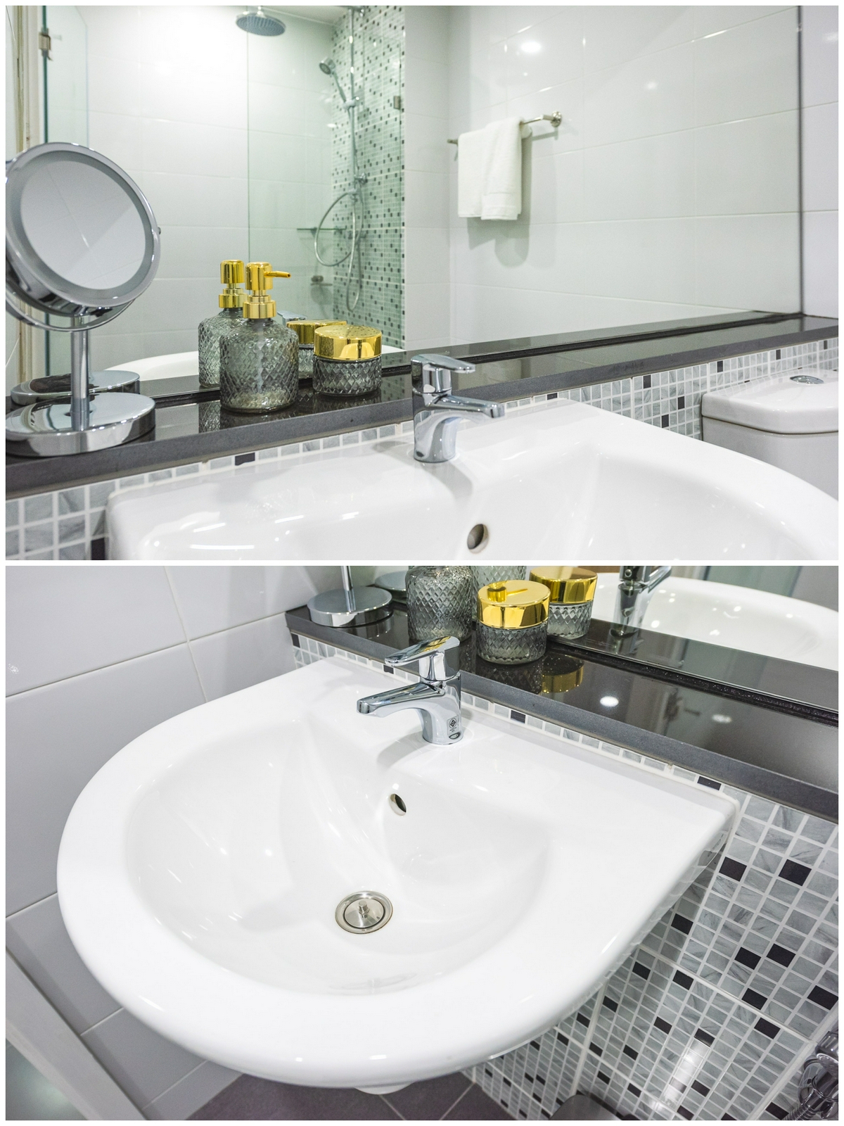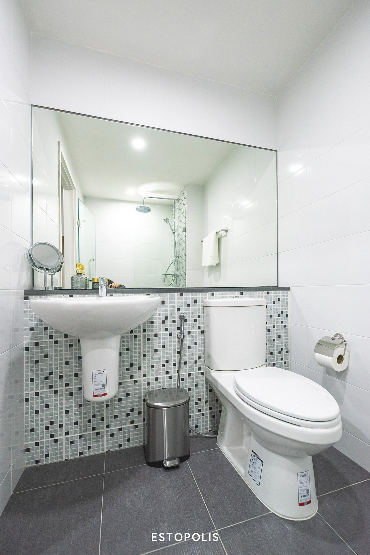พื้นของห้องน้ำปูด้วยวัสดุกระเบื้องสีเทาเข้ม ส่วนอ่างล้างหน้าจะบิลต์ติดผนัง ลอยเหนือพื้นขึ้นมา ทำให้สามารถทำความสะอาดได้ง่าย และตัวกระจกเงาที่ทางโครงการให้นั้นก็เป็น ‘กระจกใหญ่เต็มบาน’ ยาวตามขนาดห้องน้ำ ดูสวยงาม และยังทำให้ห้องดูกว้างขึ้นด้วย