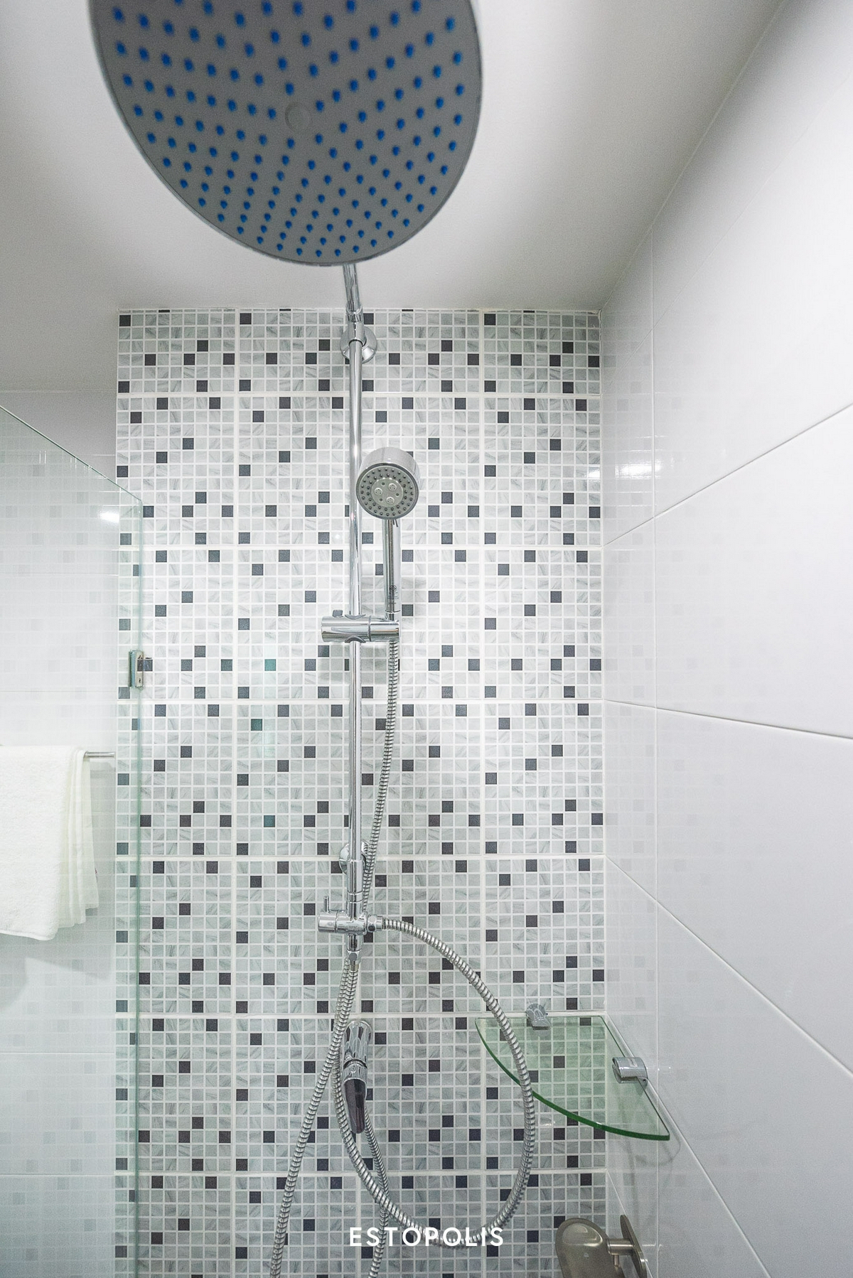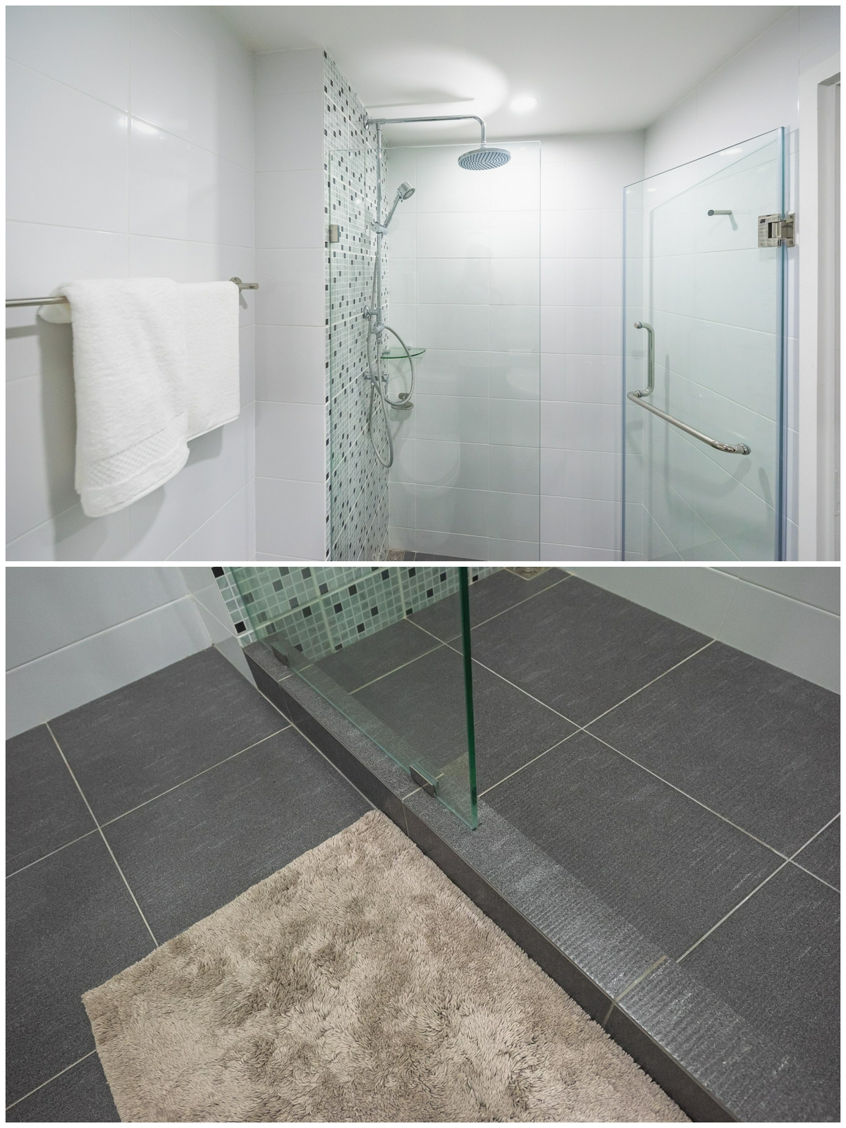 รวมถึง ‘ราวแขวนผ้าขนหนู’ ก็เป็นของแบรนด์ prema เช่นกัน ส่วนทางฝั่งของ Partition กระจก ทางโครงการจะดรอปพื้นส่วนของห้องอาบน้ำลง พร้อมทำธรณีกั้น เพื่อป้องกันน้ำไหลออกมาด้านนอก ก่อนจะติดตั้งบานกระจกเพื่อช่วยป้องกันน้ำกระเด็นอีกชั้นหนึ่งนั่นเอง