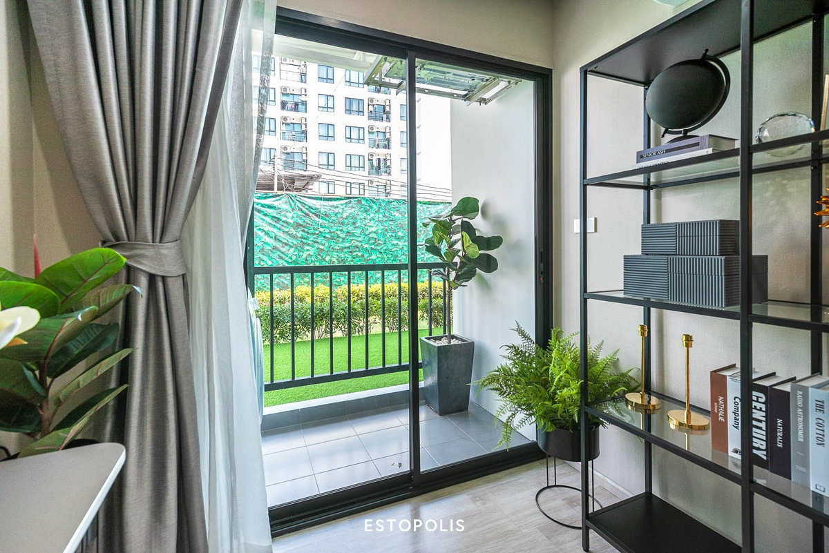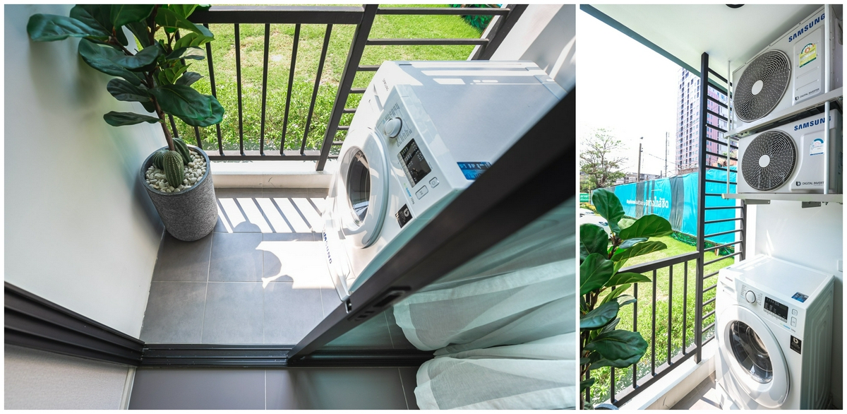 เมื่อเดินออกไปยัง ‘ระเบียง’ จะมีพื้นที่เพียงพอให้เราสามารถใช้งานได้จริง ไม่ว่าจะใช้ติดตั้งราวตากผ้าแขวนระเบียง หรือปลูกต้นไม้ต้นเล็ก ๆ ทำเป็นสวนแนวตั้ง ก็ช่วยสร้างบรรยากาศสดชื่นให้กับห้องได้เป็นอย่างดี บริเวณเหนือประตูกระจกขึ้นไปจะเป็นจุดแขวนคอมเพรซเซอร์แอร์ ในลักษณะหันออกนอกอาคาร