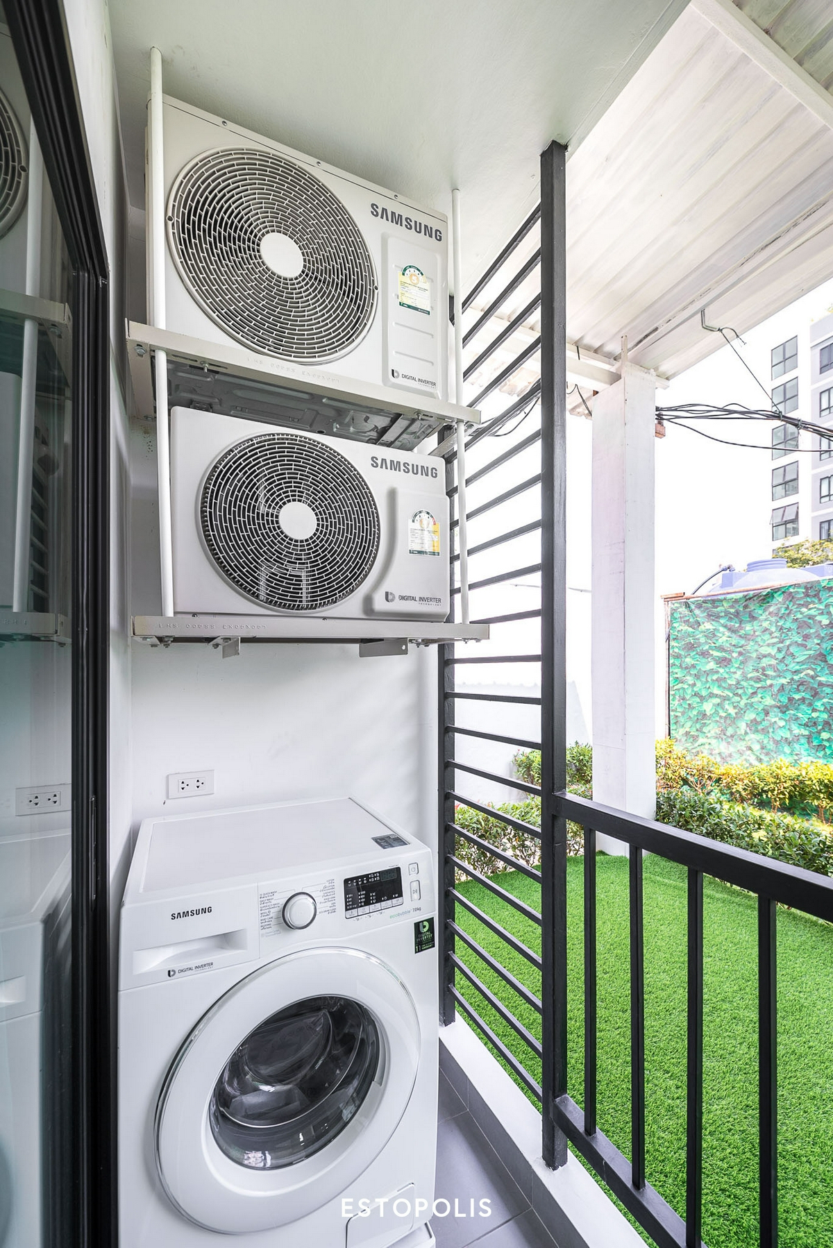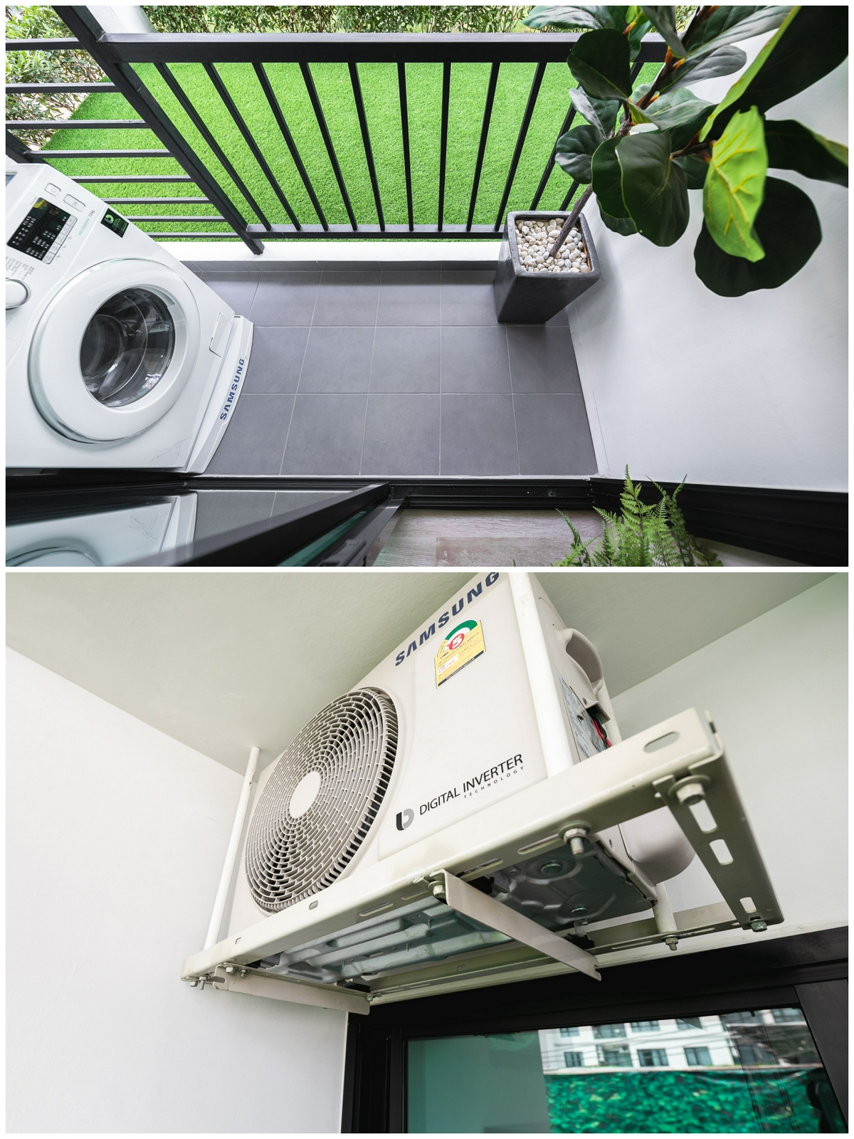 ส่วนฝั่งซ้ายมือของระเบียง ก็จะแขวนคอมเพรสเซอร์แอร์ไว้ทางด้านบนอีก 2 เครื่อง โดยด้านล่างจะมีการวางระบบไฟและระบบน้ำ สำหรับการติดตั้งเครื่องซักผ้าเอาไว้ให้ และมีท่อระบายน้ำอยู่ตรงพื้นใกล้ ๆ กัน เราจึงหมดกังวลเรื่องคราบน้ำขังที่พื้นระเบียงไปได้เลย