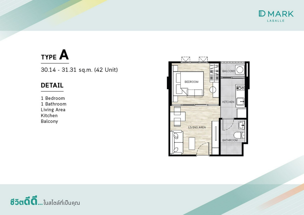 TYPE A : 1 Bedroom ขนาด 30.14 - 31.31 ตร.ม.