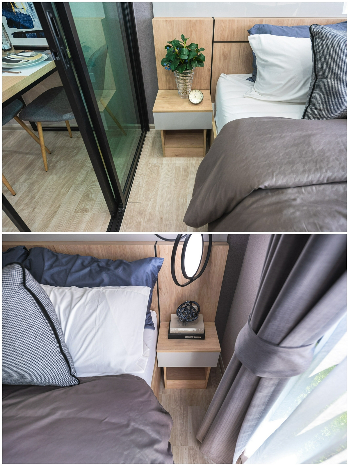 สำหรับเฟอร์นิเจอร์ที่ได้เพิ่มเติมจากห้อง Type แรกจะเป็น ‘โต๊ะหัวเตียง 2 ตัว’ ซึ่งอยู่ติดกับหัวเตียงทั้งฝั่งซ้ายและขวา ช่วยเพิ่มพื้นที่จัดเก็บให้มากขึ้น ส่วนพื้นที่โดยรอบของเตียงก็สามารถเดินเข้า-ออกได้สะดวก ไม่อึดอัด