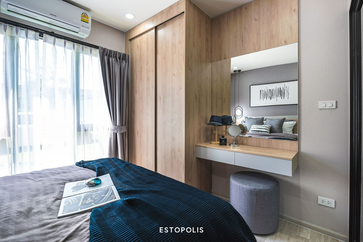 บริเวณปลายเตียงของห้องจะเพิ่มมาในส่วนของ ‘โต๊ะเครื่องแป้ง’ เข้ามา บิลต์อินอยู่ติดกับตู้เสื้อผ้าขนาดใหญ่ เต็มความสูงห้อง