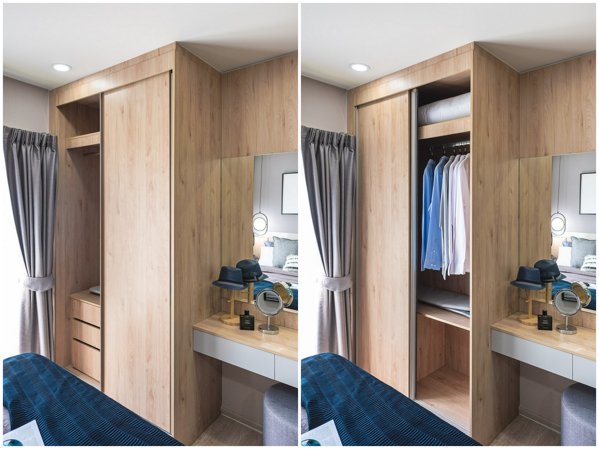 พื้นที่จัดเก็บภายในของตู้เสื้อผ้านั้น จะจัดแบ่งสัดส่วนให้เหมือนกับห้อง Type แรก ที่ยังคงปริมาณการจัดเก็บไว้ให้อย่างจุใจ แตกต่างกันก็แค่ตรงหน้าบานตู้ ที่ตู้ของห้องนี้จะได้เป็นวัสดุลายไม้ทั้งหมดแทน