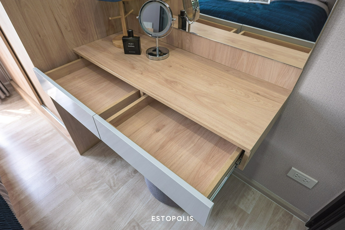 ทางโครงการจะบิลต์อิน ‘โต๊ะเครื่องแป้ง’ แบบติดผนังมาให้ พร้อมลิ้นชัก 2 บาน สามารถจัดเก็บอุปกรณ์ทำผมและเครื่องสำอางต่าง ๆ ได้อย่างเป็นระเบียบ นอกจากนี้พื้นที่บริเวณหน้าโต๊ะยังสามารถวางกระจก, หวี, เครื่องประดับ, น้ำหอม และเครื่องสำอางอื่น ๆ ได้อีกมากมาย รับรองว่า... ถูกใจทุกคนอย่างแน่นอน