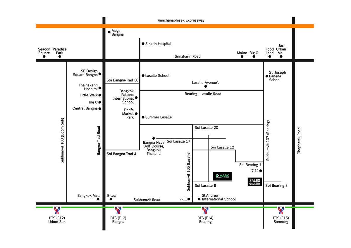 โครงการ D Mark Condo @ Lasalle ตั้งอยู่ใน ‘ซอยลาซาล 8’ ใกล้กับ BTS แบริ่ง และถนนสุขุมวิท เพียง 650 เมตร อีกทั้งยังอยู่ใกล้กับจุดขึ้น-ลงทางด่วนเพียง 2.3 กิโลเมตร ทำให้การเดินทางเข้า-ออกเมืองในพื้นที่โซนนี้ค่อนข้างคล่องตัว และสะดวกสบายมากทีเดียว ขณะเดียวกัน พื้นที่โครงการยังอยู่ใกล้กับแหล่งไลฟ์สไตล์ชั้นนำอีกมากมายด้วย