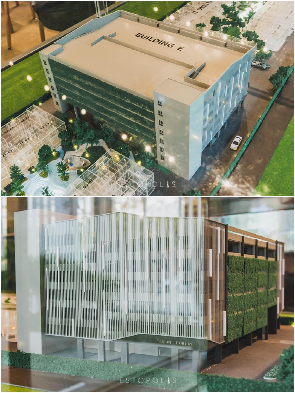อาคาร E เป็นอาคารจอดรถและพื้นที่ส่วนกลางสูง 7 ชั้น ตั้งอยู่ตรงกลางของโครงการ ทำให้ผู้พักอาศัยสามารถใช้งานได้อย่างทั่วถึง โดยเฉพาะอาคาร D , F และ G ที่อยู่ใกล้กว่าเพื่อน