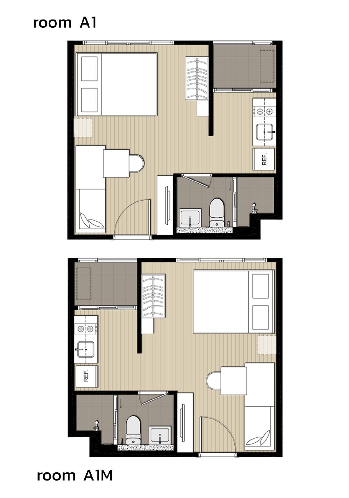 สำหรับ ห้อง Type A1M จะได้พื้นที่พักผ่อนที่กว้างขวาง โดยรวมเอาห้องนอนและห้องรับแขกเข้าไว้ด้วยกัน ทำให้ห้องดูปลอดโปร่ง โล่งสบายตา ทั้งยังติดหน้าต่างบานใหญ่ไว้ตรงริมสุดห้อง คอยเปิดรับแสงจากธรรมชาติให้ส่องเข้ามาได้อย่างเต็มที่ มีพื้นที่ประกอบอาหารอยู่ด้านในเชื่อมกับระเบียง ส่วนห้องน้ำจะอยู่ทางขวามือใกล้ๆ กัน