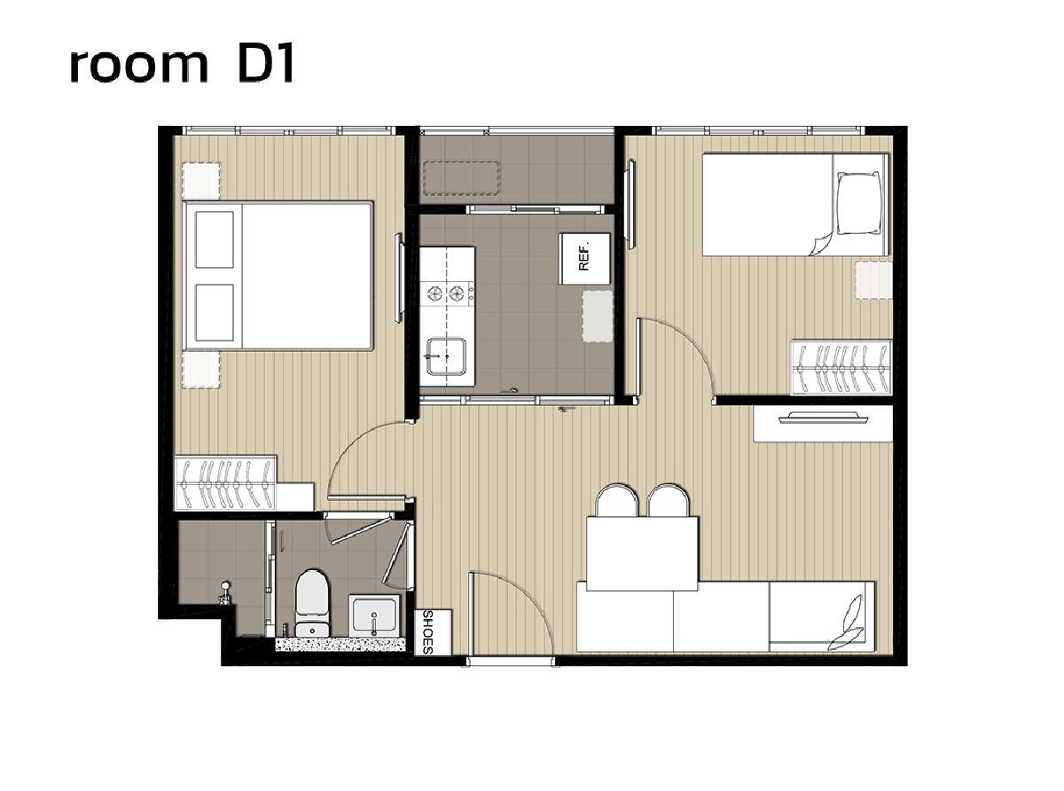 ห้อง Type D1 ขนาด 2 Bedrooms พื้นที่ใช้สอย 43.50 ตารางเมตร จะสะดวกเวลาทำอาหารมื้อเล็กๆ ทานกันเอง แล้วค่อยยกจานมานั่งทานที่ห้องรับแขก เนื่องจาก Living Area มีพื้นที่กว้างให้ตั้งโต๊ะทานข้าวเพิ่มได้ ส่วนห้องจะเข้าออกได้ 2 ทาง คือ จากทางห้องนอนและห้องนั่งเล่น จึงสะดวกเวลาเข้าห้องน้ำตอนกลางคืน หรือคนที่อยากแต่งตัวในห้องนอน