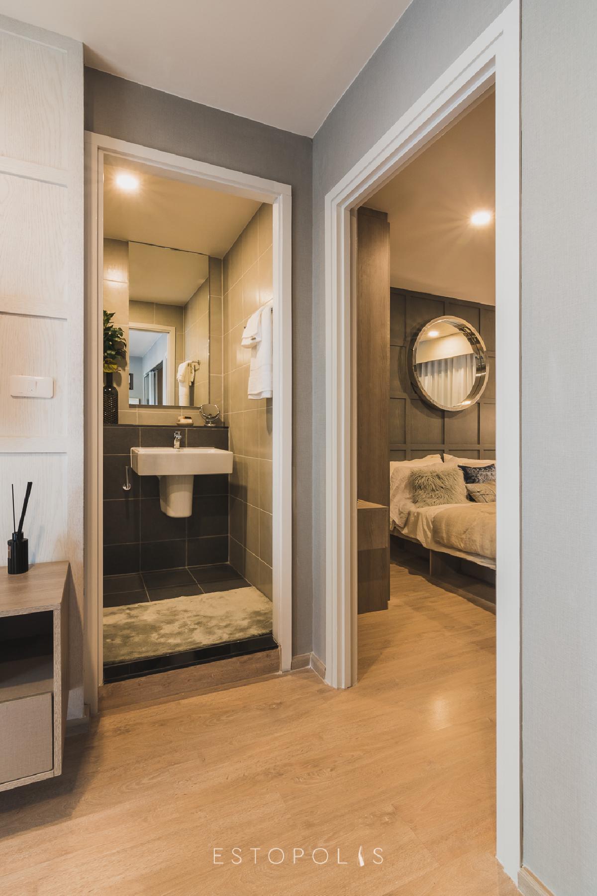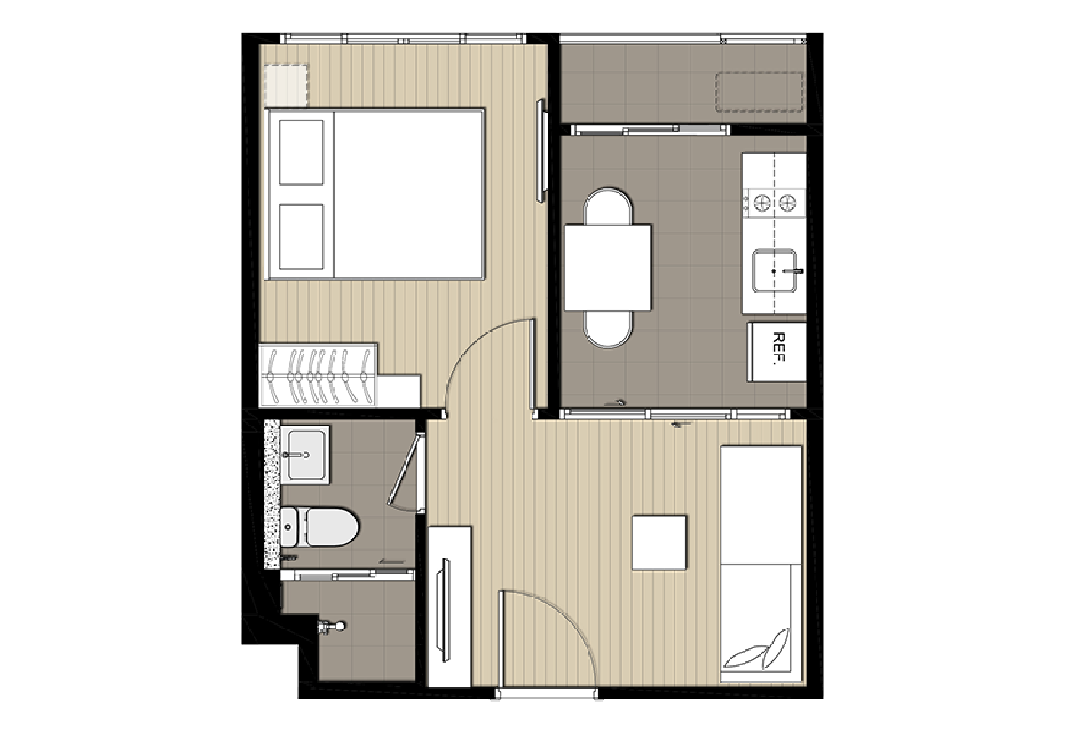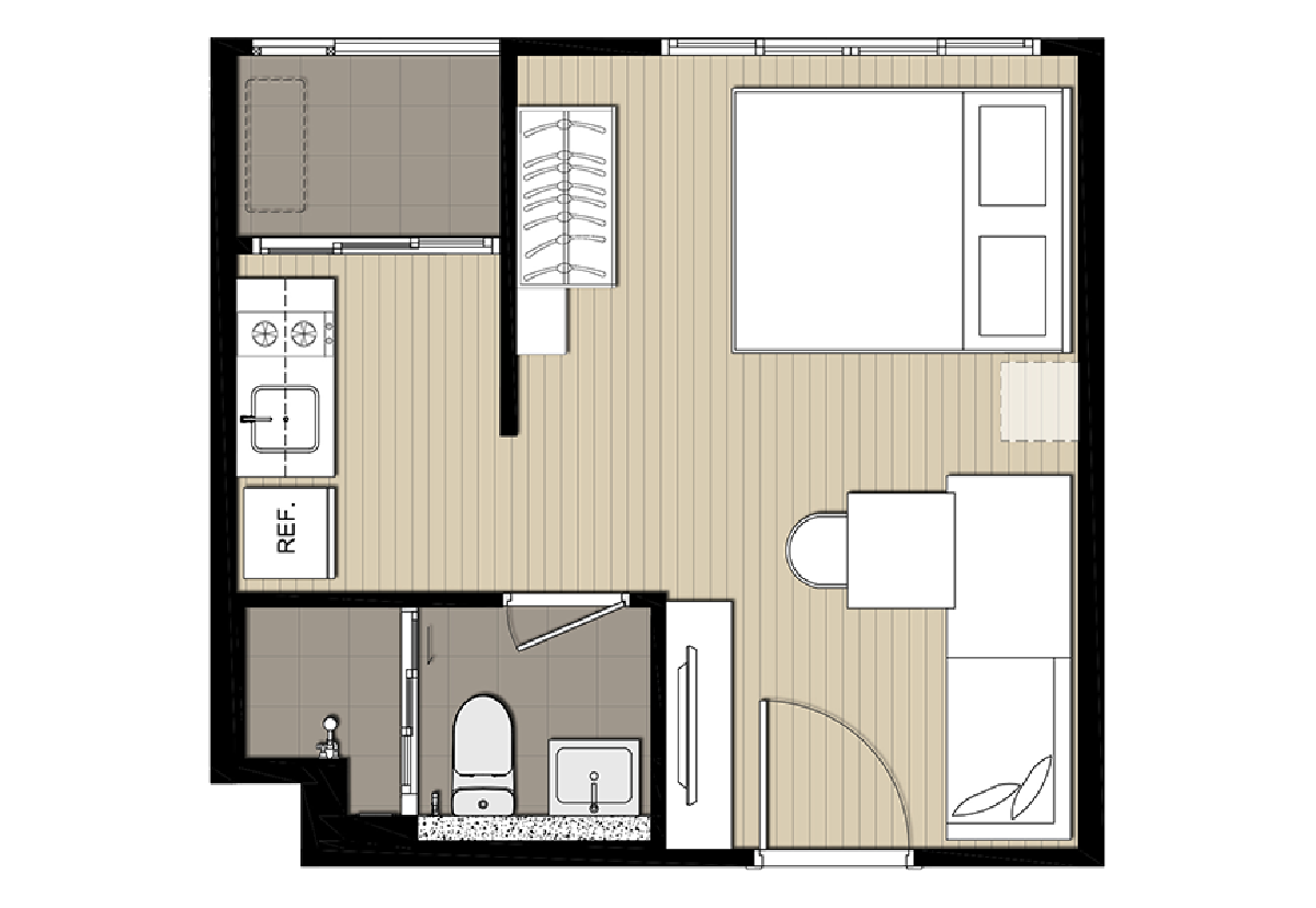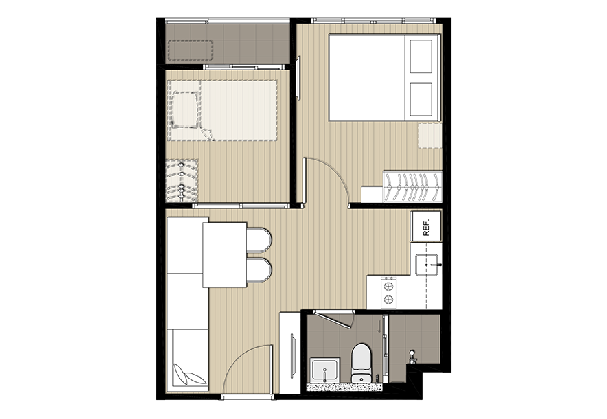 ห้องนอน ติดตั้งประตูเปิด-ปิดมิดชิด เพื่อความเป็นส่วนตัวของผู้พักอาศัย โดยมี ห้องรับแขก อยู่ด้านนอก ไว้สำหรับการผ่อนคลายและต้อนรับเพื่อนฝูง ข้างๆ เป็น ห้องครัวแบบปิด เชื่อมกับระเบียงด้านนอก เหมาะสำหรับคนชอบทำอาหารเป็นประจำ ส่วน ห้องน้ำ จะหลบอยู่ข้างในติดกับ ห้องนอน ทำให้สะดวกเวลาใช้งานทั้งผู้อาศัยและผู้มาเยี่ยน
