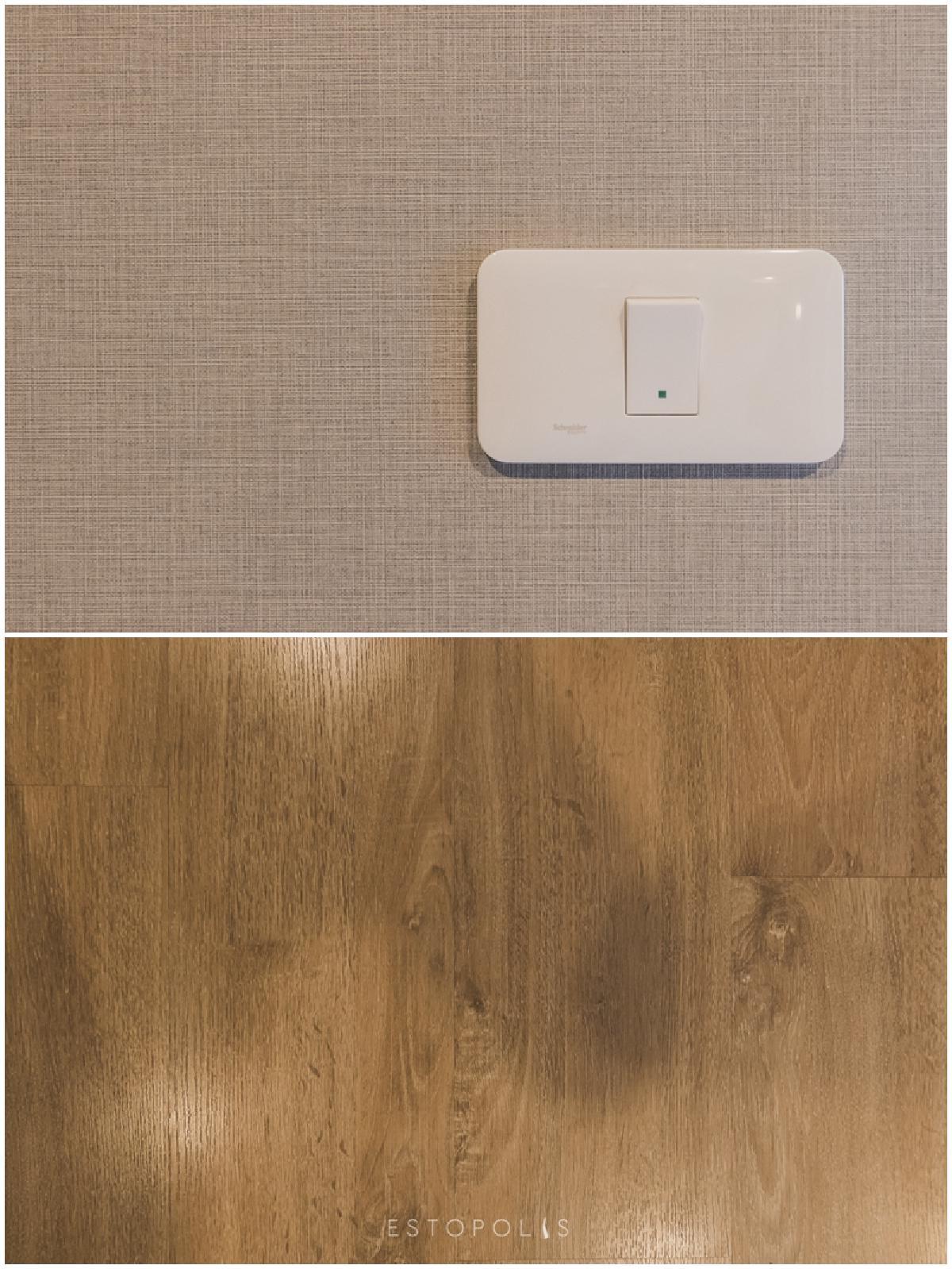 พื้นห้องทั่วไปปูลามิเนตลายไม้กลมกลืนไปกับเฟอร์นิเจอร์ ส่วนผนังห้องจริงจะเป็นฉาบเรียบทาสี ซึ่งเราสามารถใส่จุดเด่นด้วยการติดวอลล์เปเปอร์ เพื่อไม่ให้ห้องน่าเบื่อเกินไป
